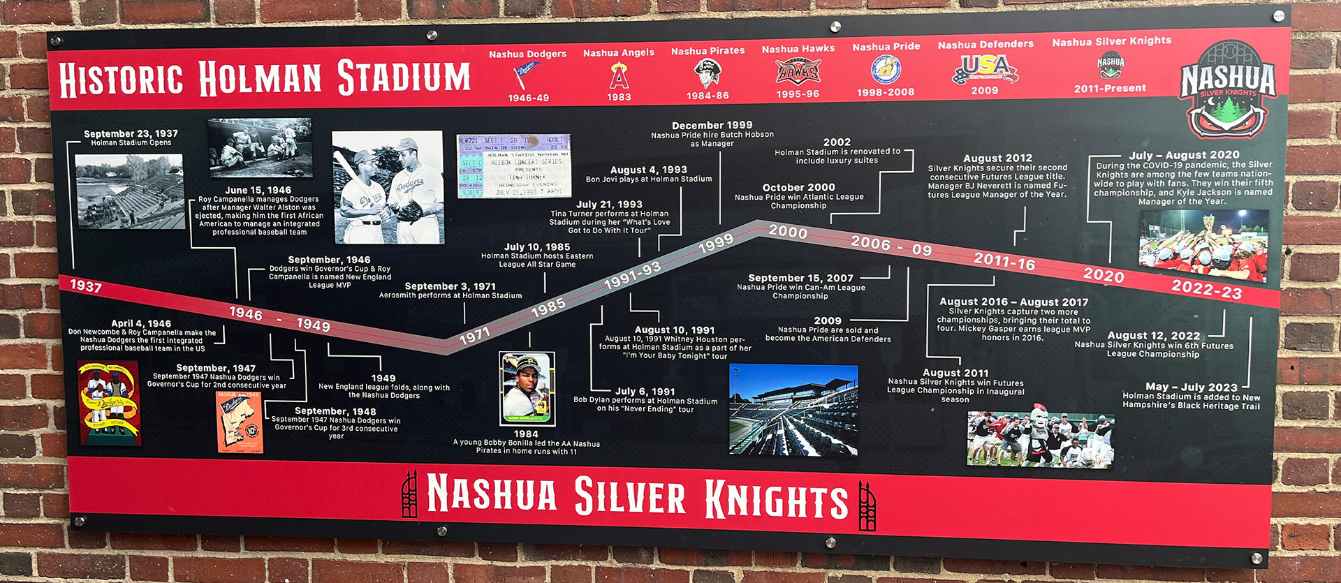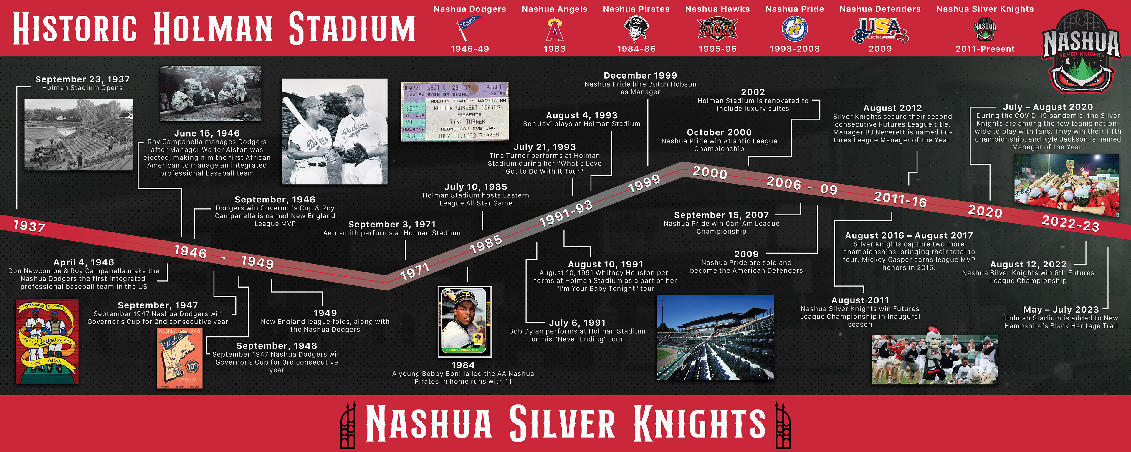 In the spring of 2025, I designed a visual timeline mural for the Nashua Silver Knights to be displayed at Historic Holman Stadium in Nashua, NH. The goal was to highlight the most important moments in the stadium’s long history — from its opening in 1937 to recent championship wins and community events.