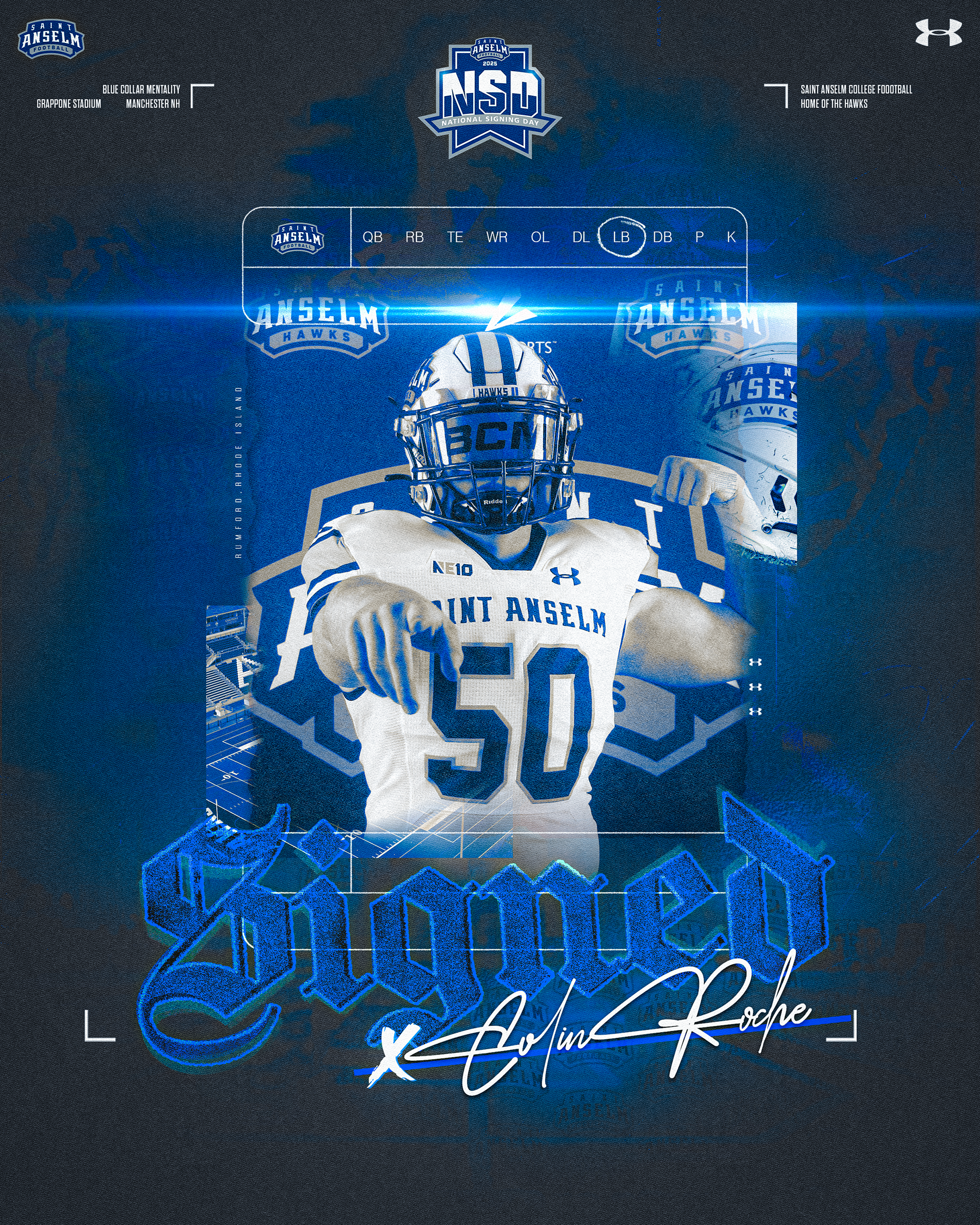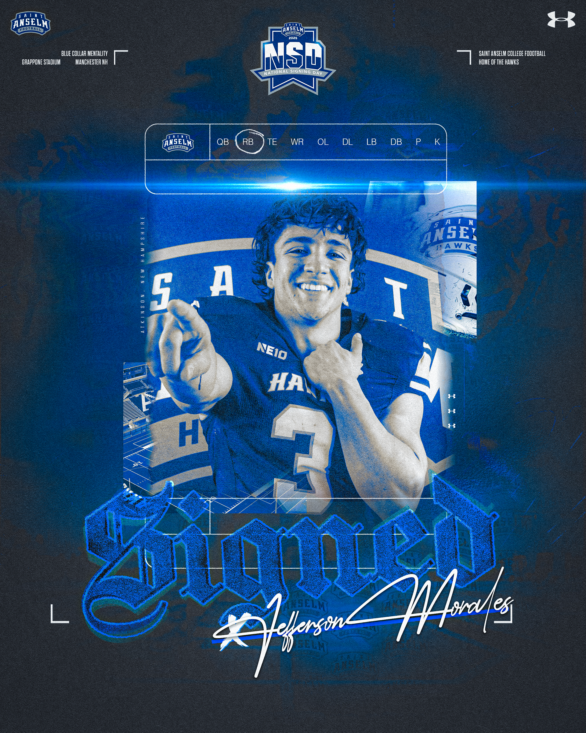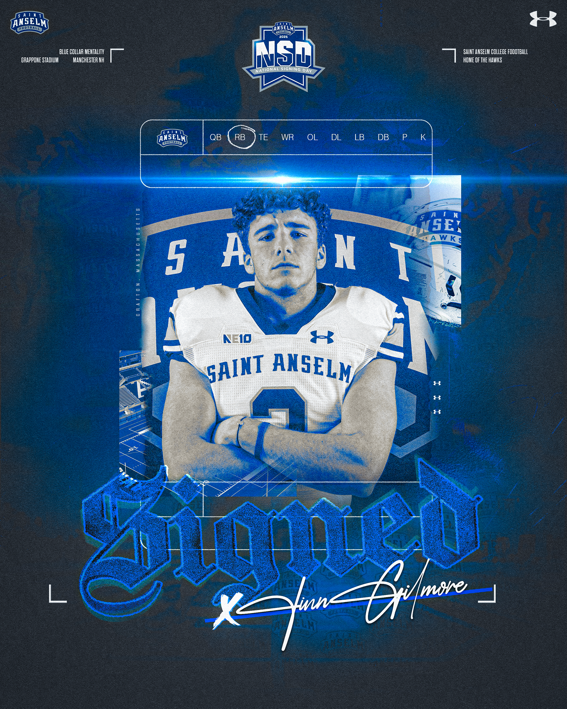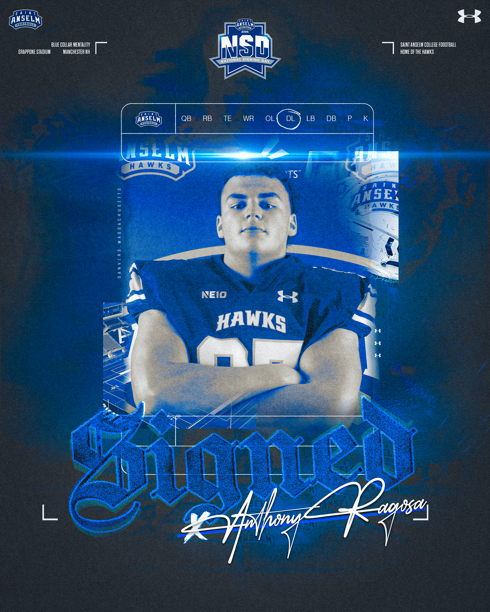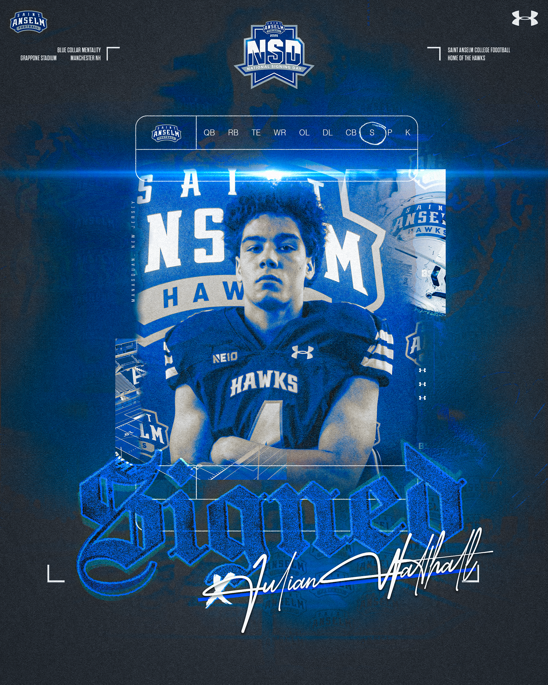 In February of 2025, I got the privilege of creating a visual identity for the Saint Anselm College Football National Signing Day class of 2025. The Hawks brought in over 40 freshman and transfer recruits to their 2025 signing class. Each recruit was given a personalized graphic that was posted to the team's Instagram & X account. Here is my work: