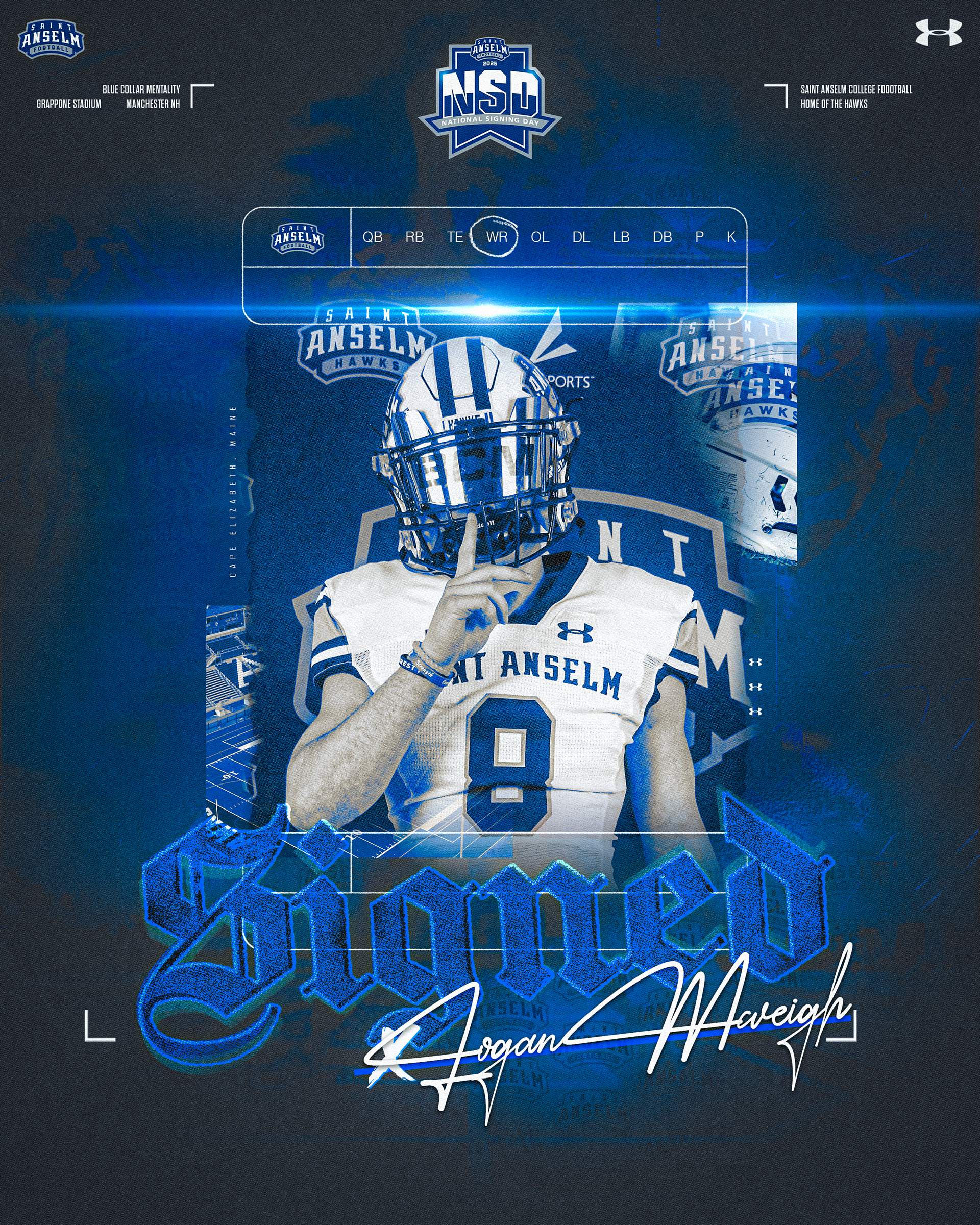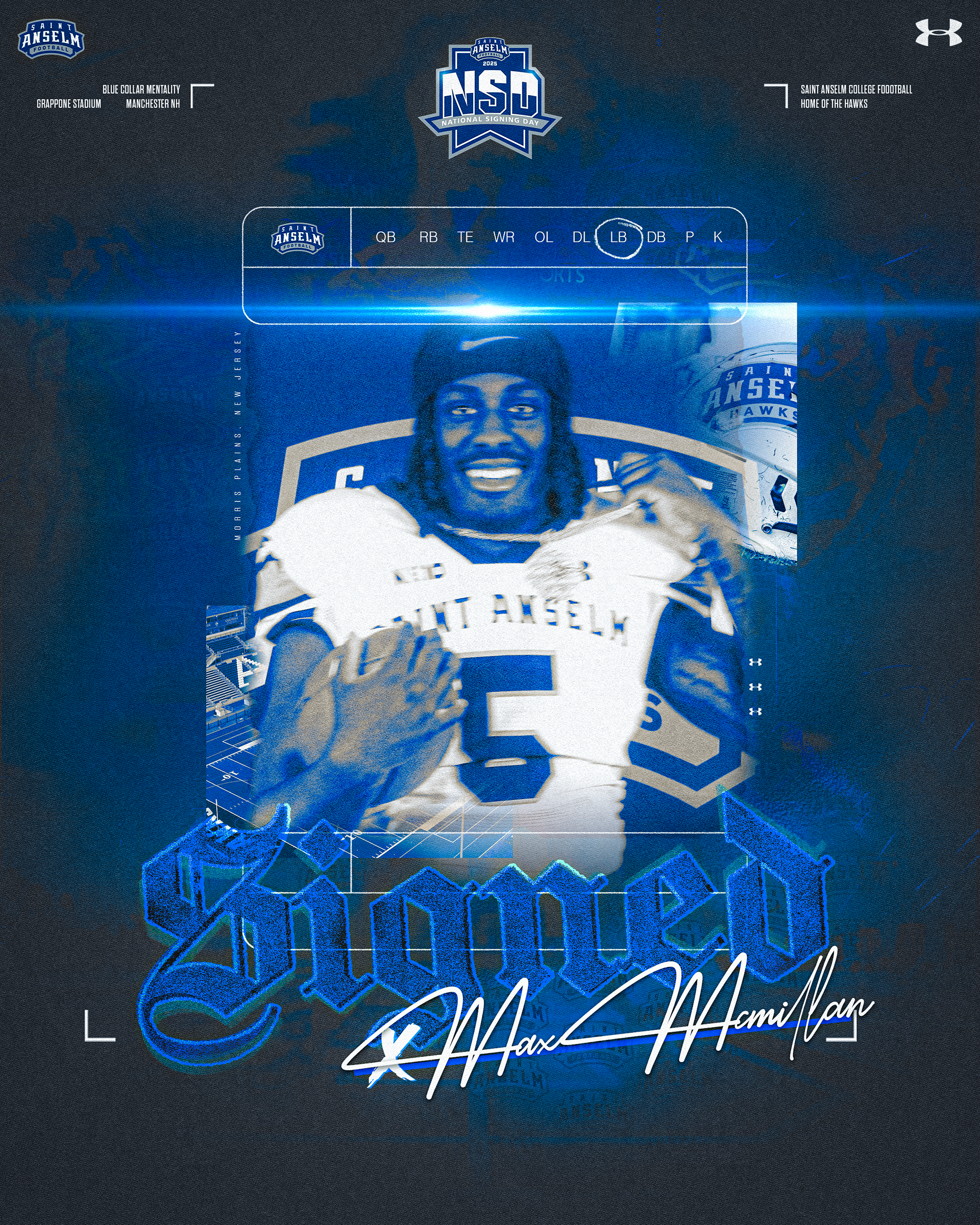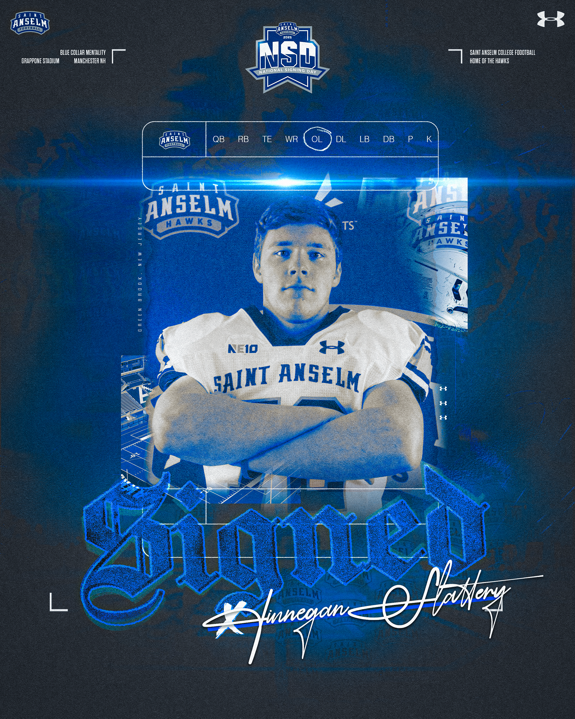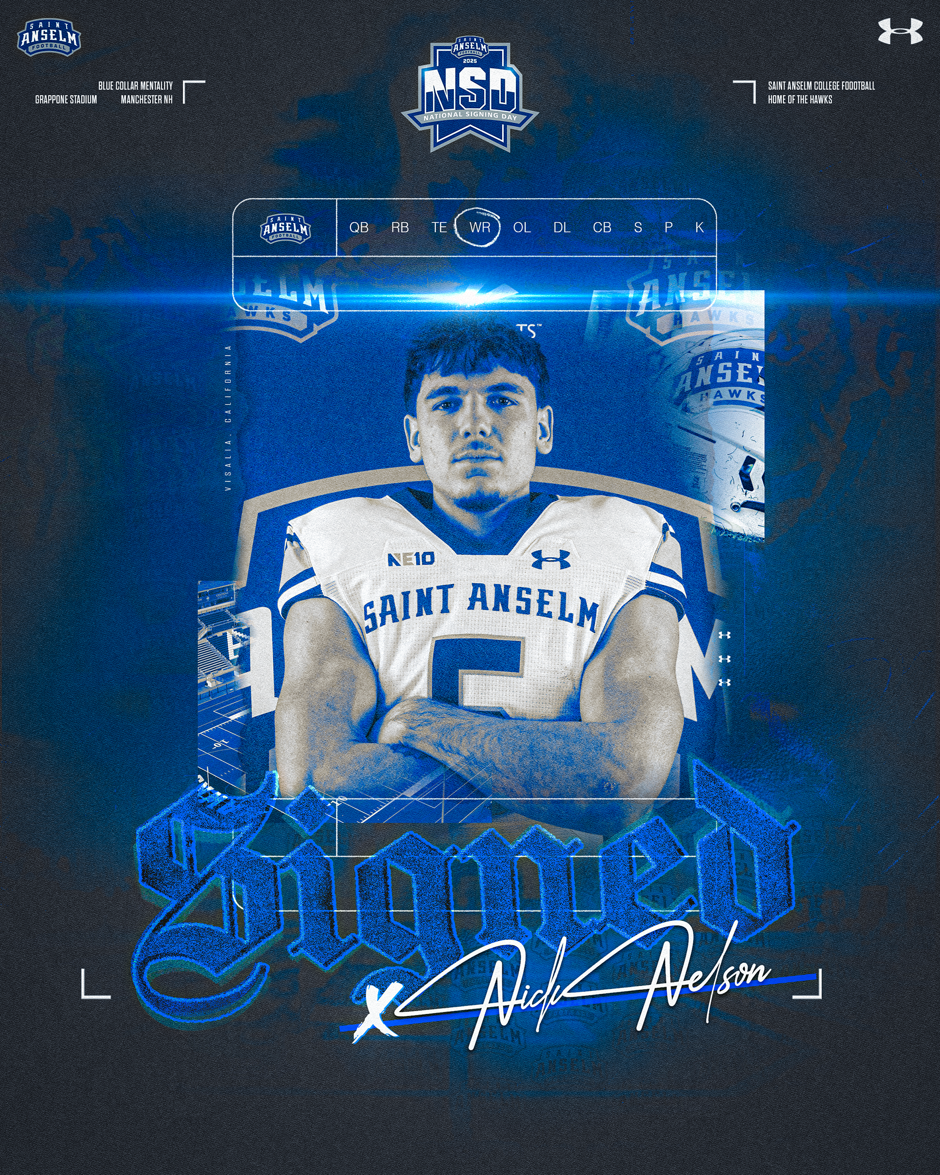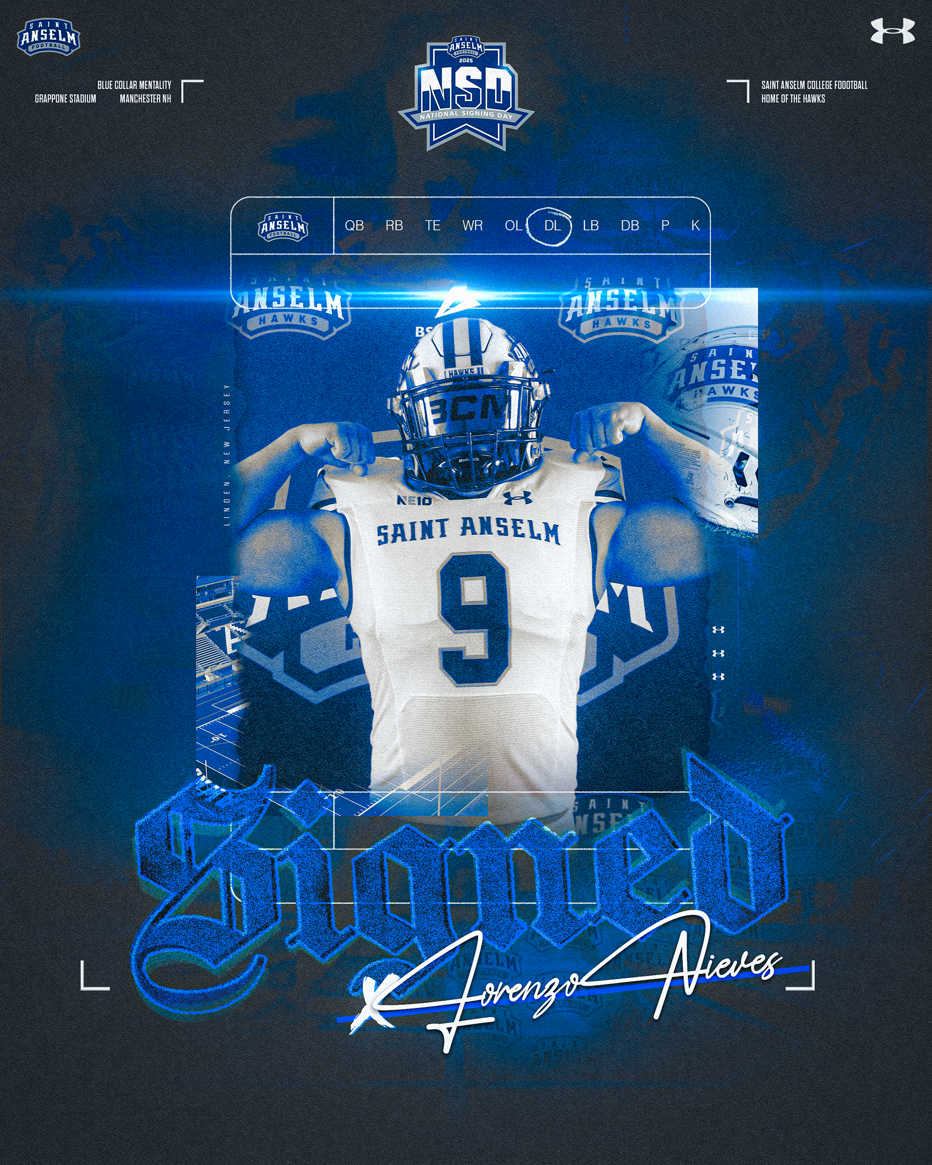 In February of 2025, I got the privilege of creating a visual identity for the Saint Anselm College Football National Signing Day class of 2025. The Hawks brought in over 40 freshman and transfer recruits to their 2025 signing class. Each recruit was given a personalized graphic that was posted to the team's Instagram & X account. Here is my work: