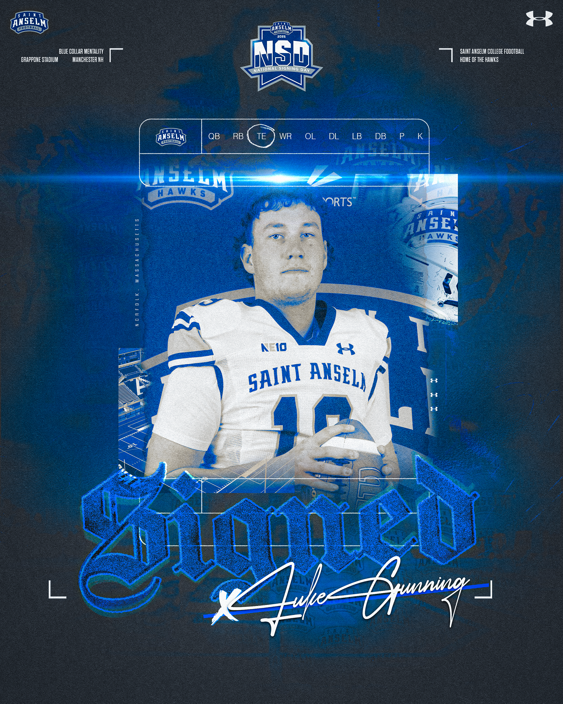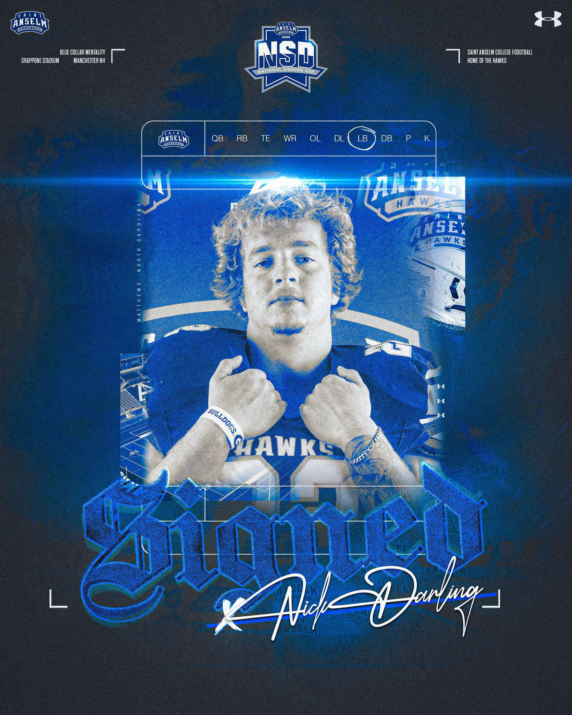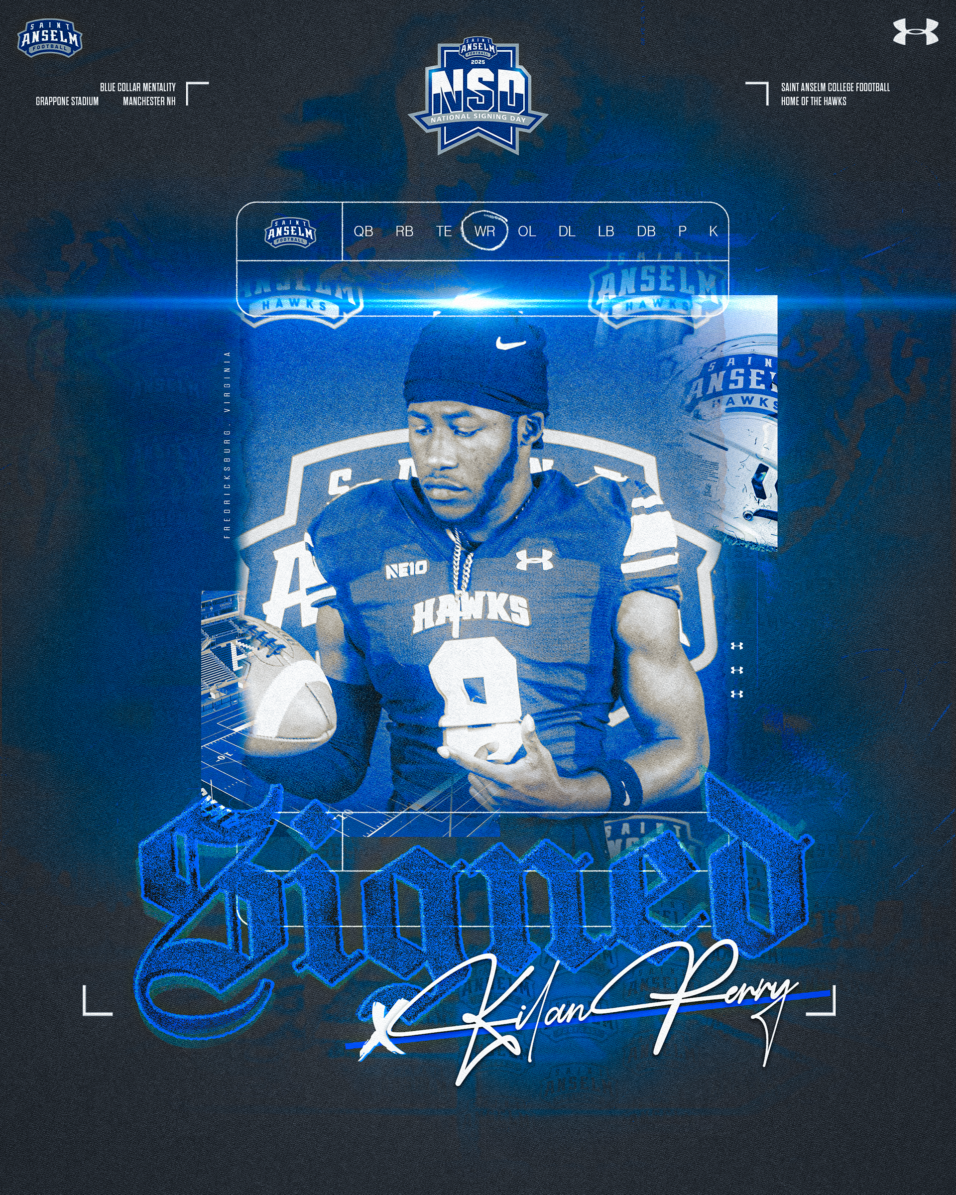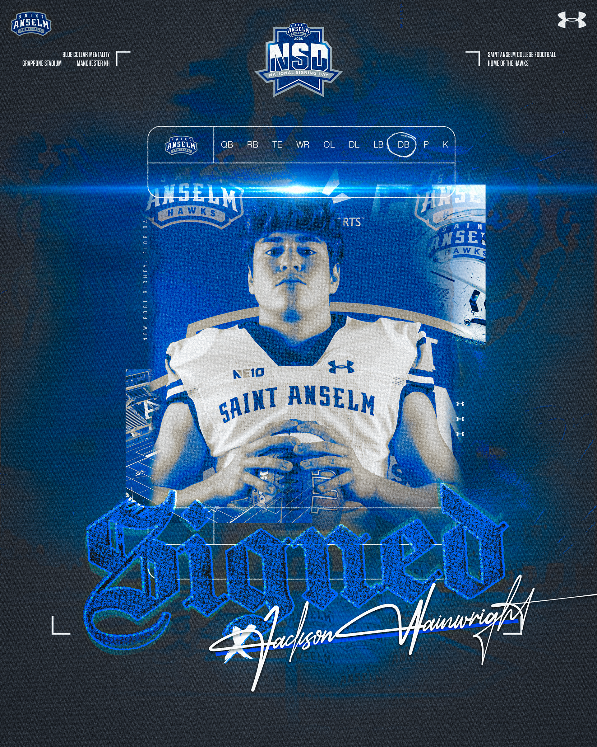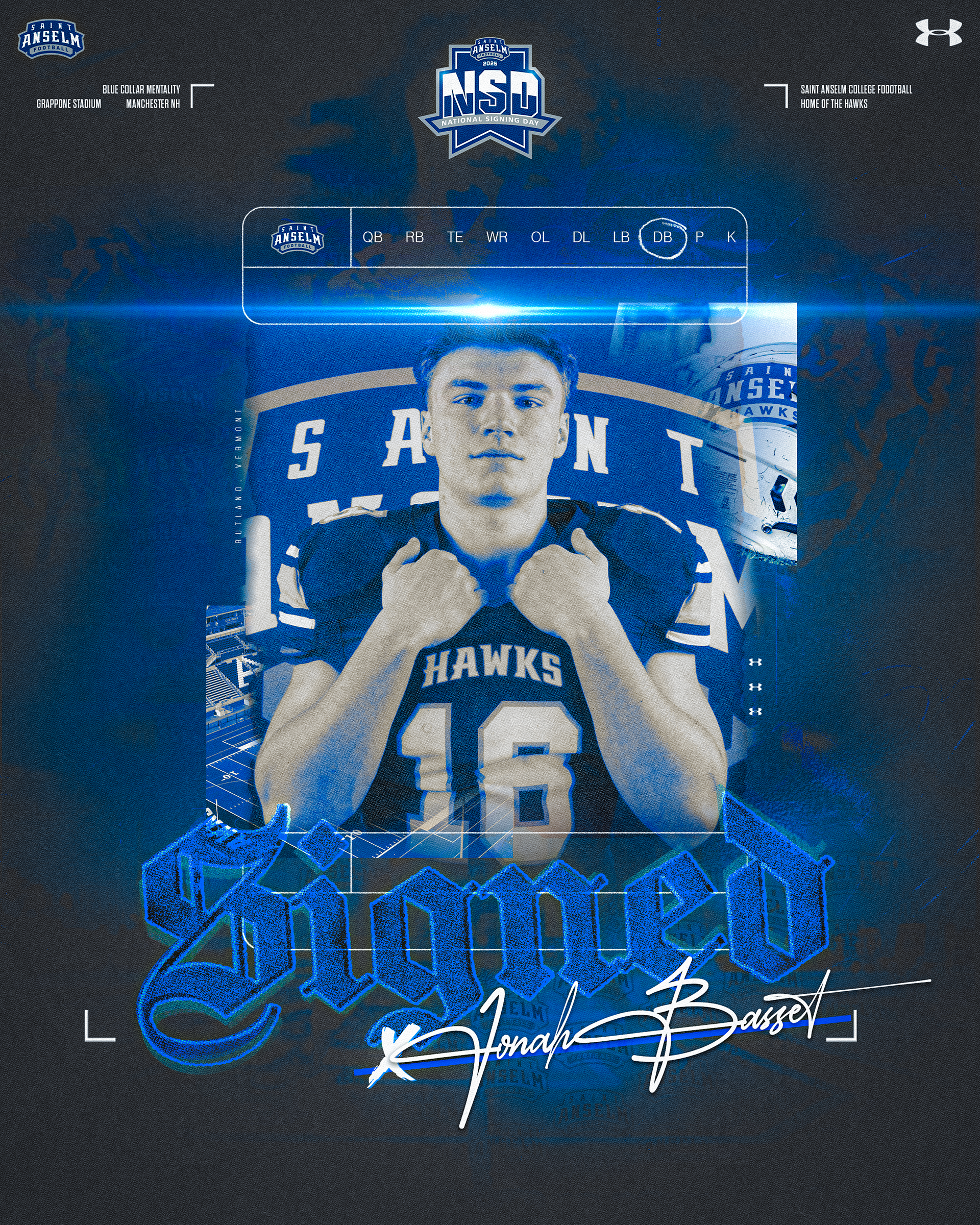 In February of 2025, I got the privilege of creating a visual identity for the Saint Anselm College Football National Signing Day class of 2025. The Hawks brought in over 40 freshman and transfer recruits to their 2025 signing class. Each recruit was given a personalized graphic that was posted to the team's Instagram & X account. Here is my work: