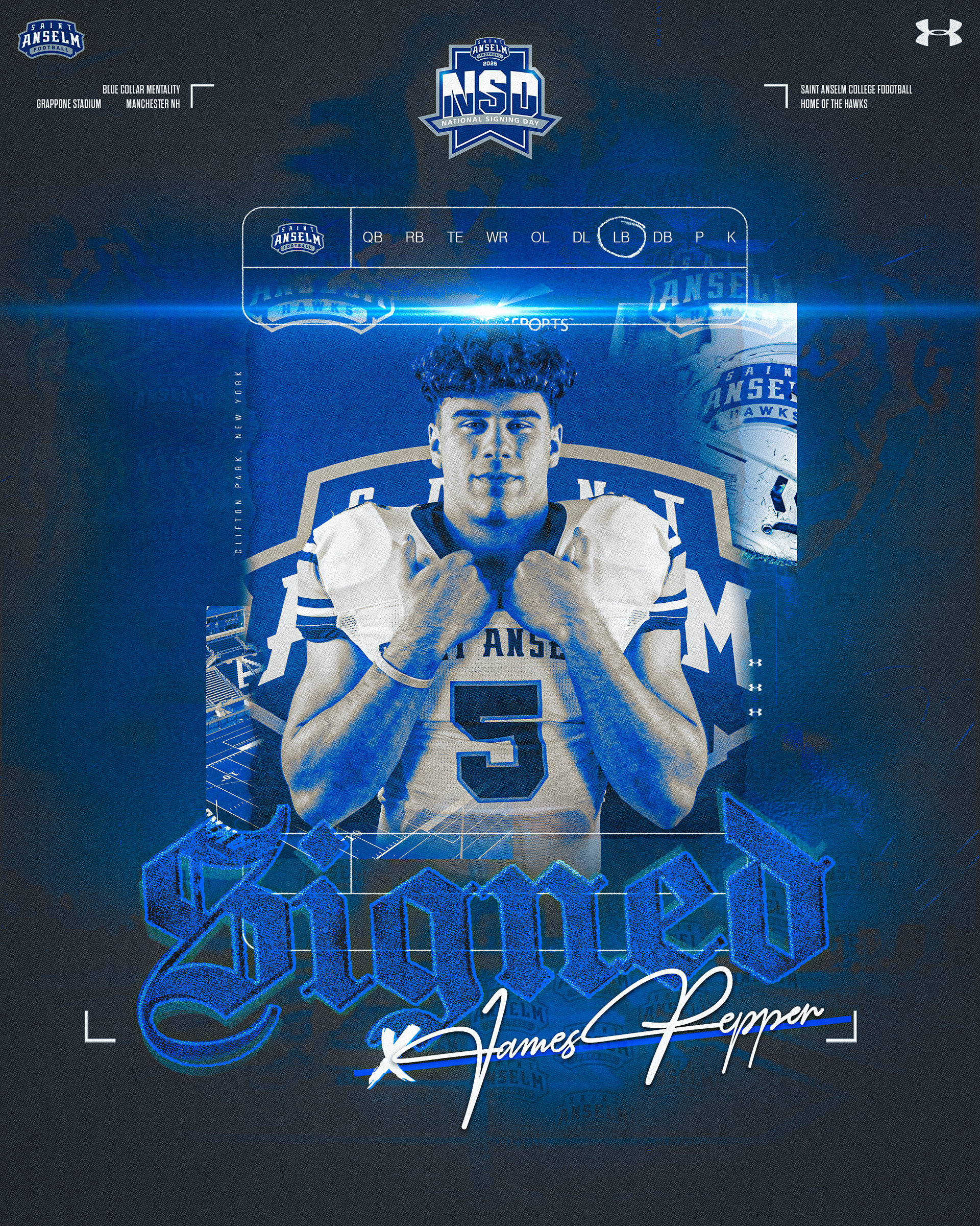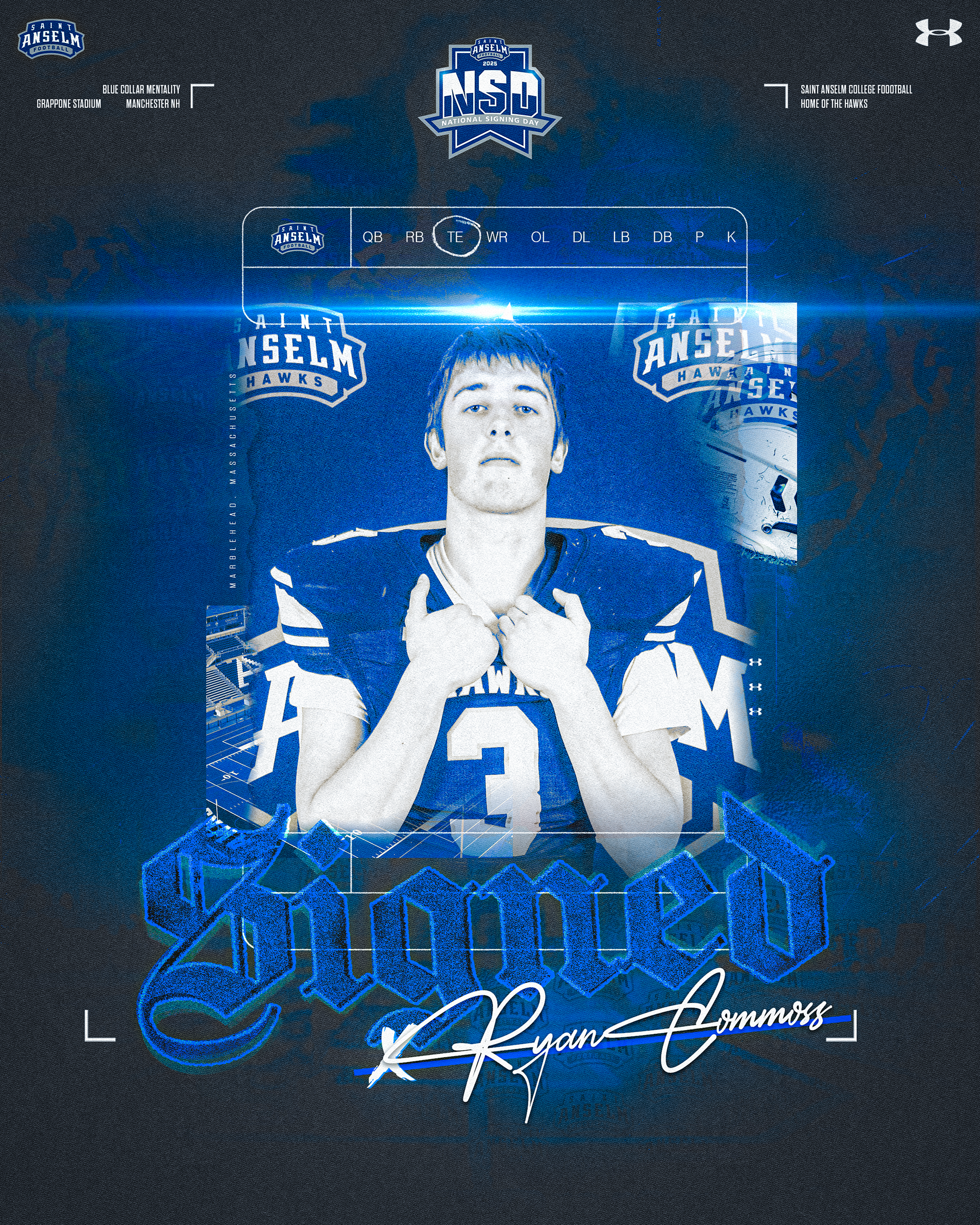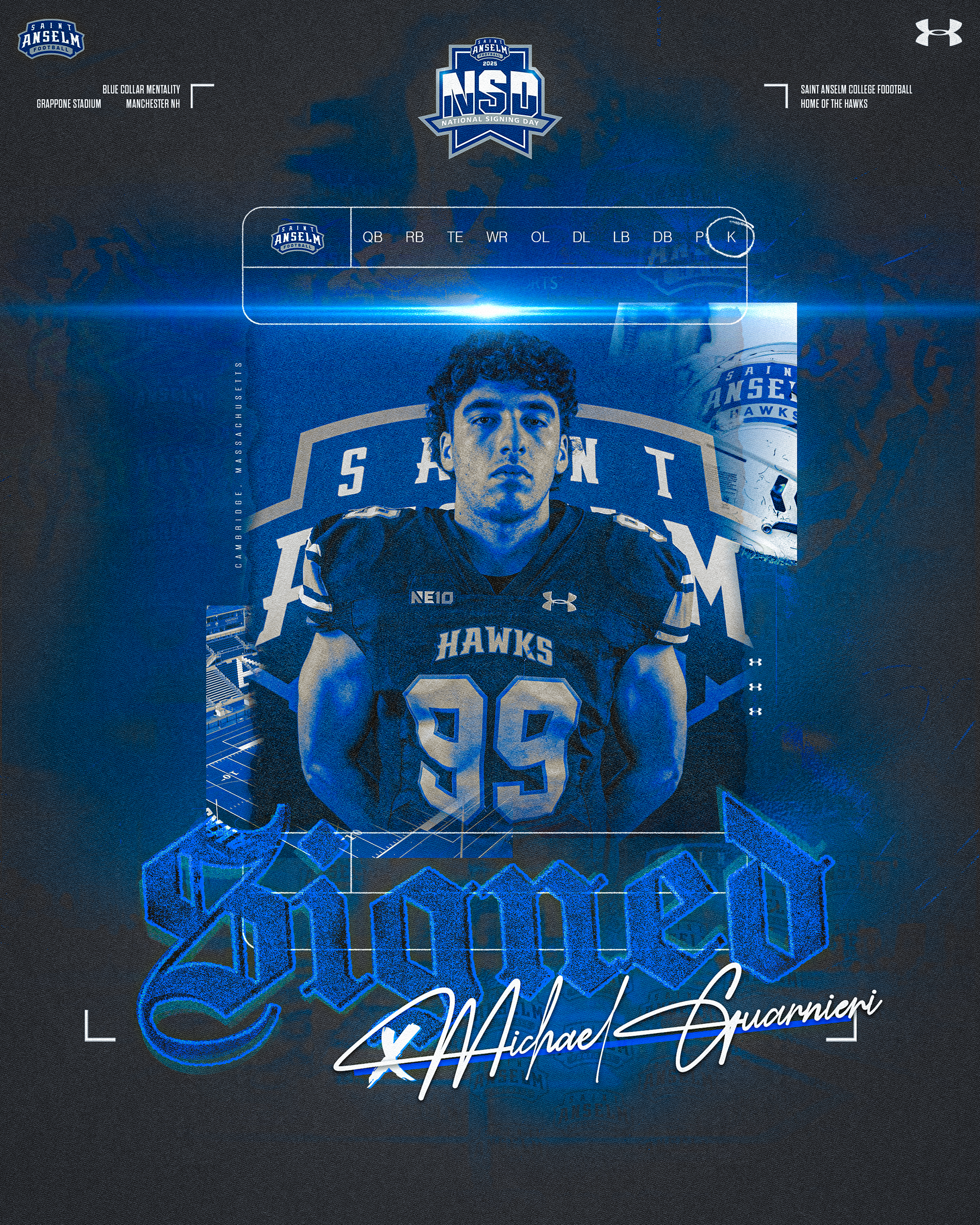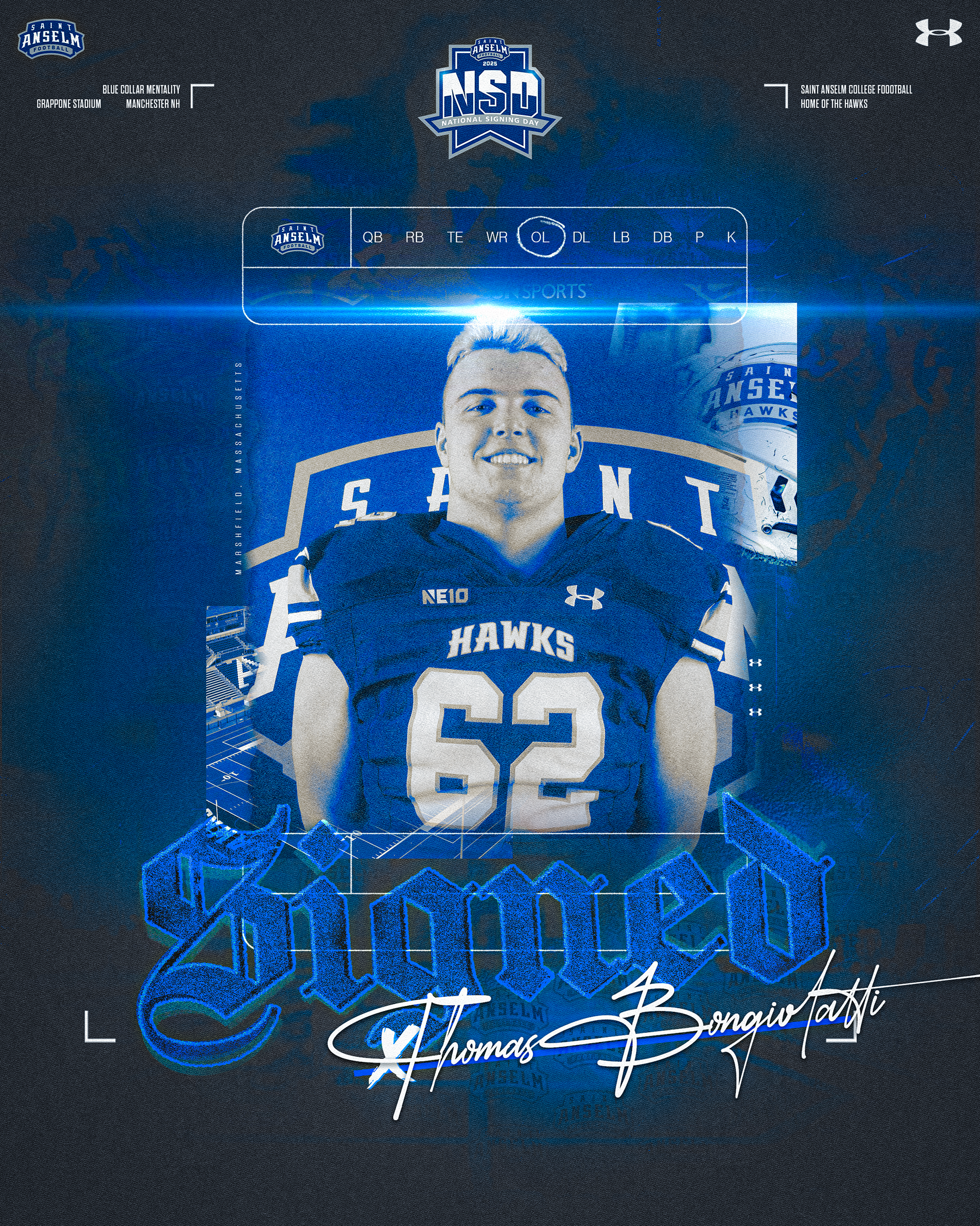 In February of 2025, I got the privilege of creating a visual identity for the Saint Anselm College Football National Signing Day class of 2025. The Hawks brought in over 40 freshman and transfer recruits to their 2025 signing class. Each recruit was given a personalized graphic that was posted to the team's Instagram & X account. Here is my work: