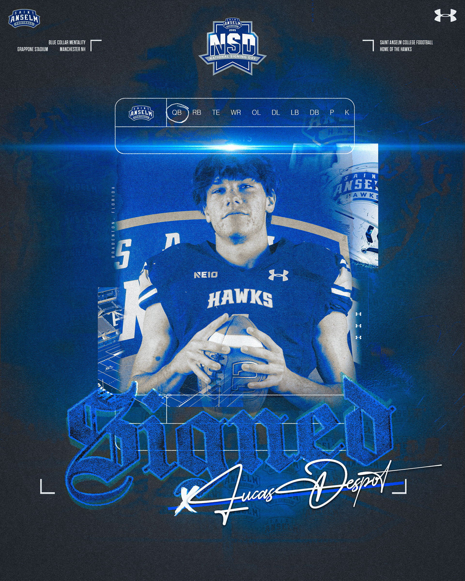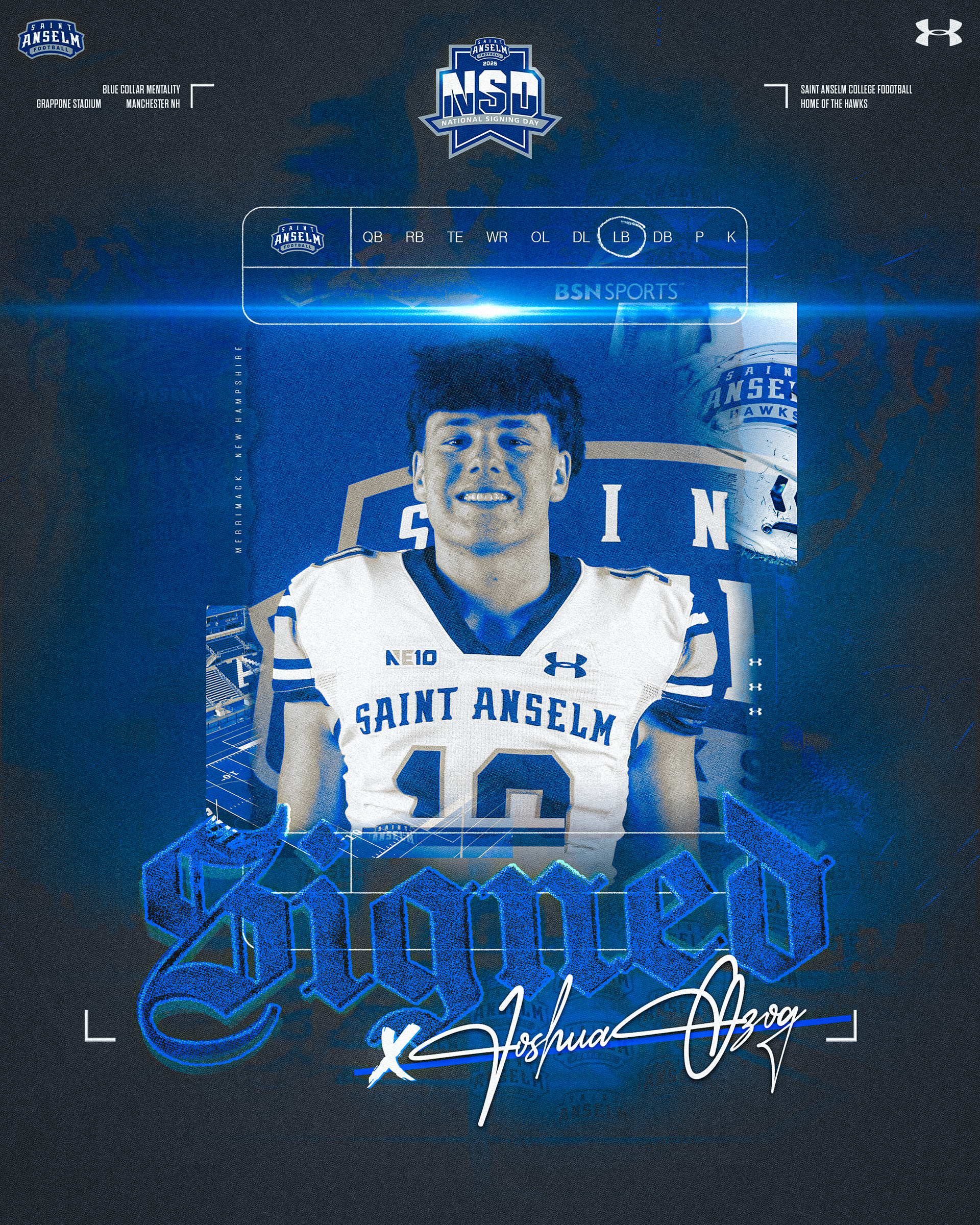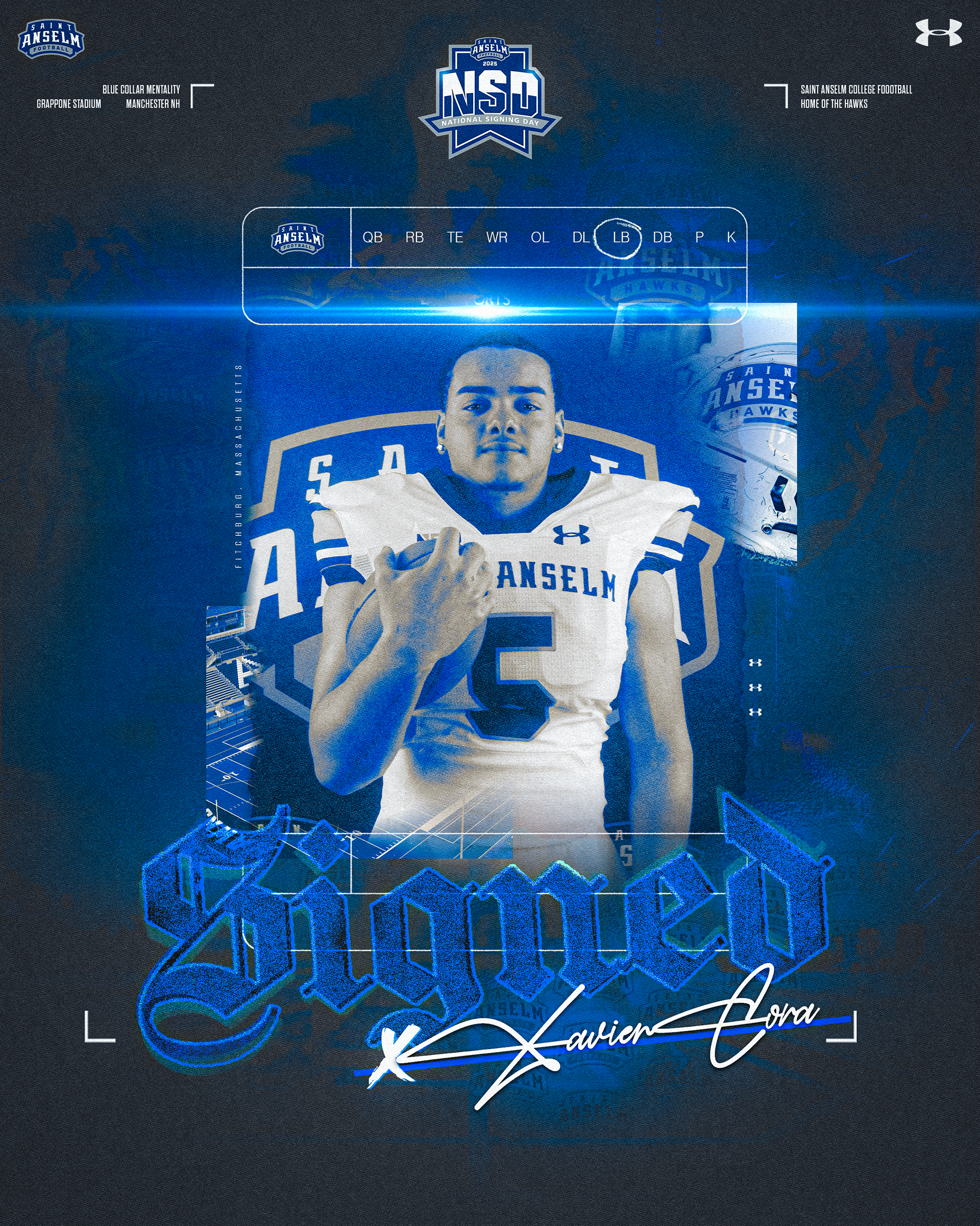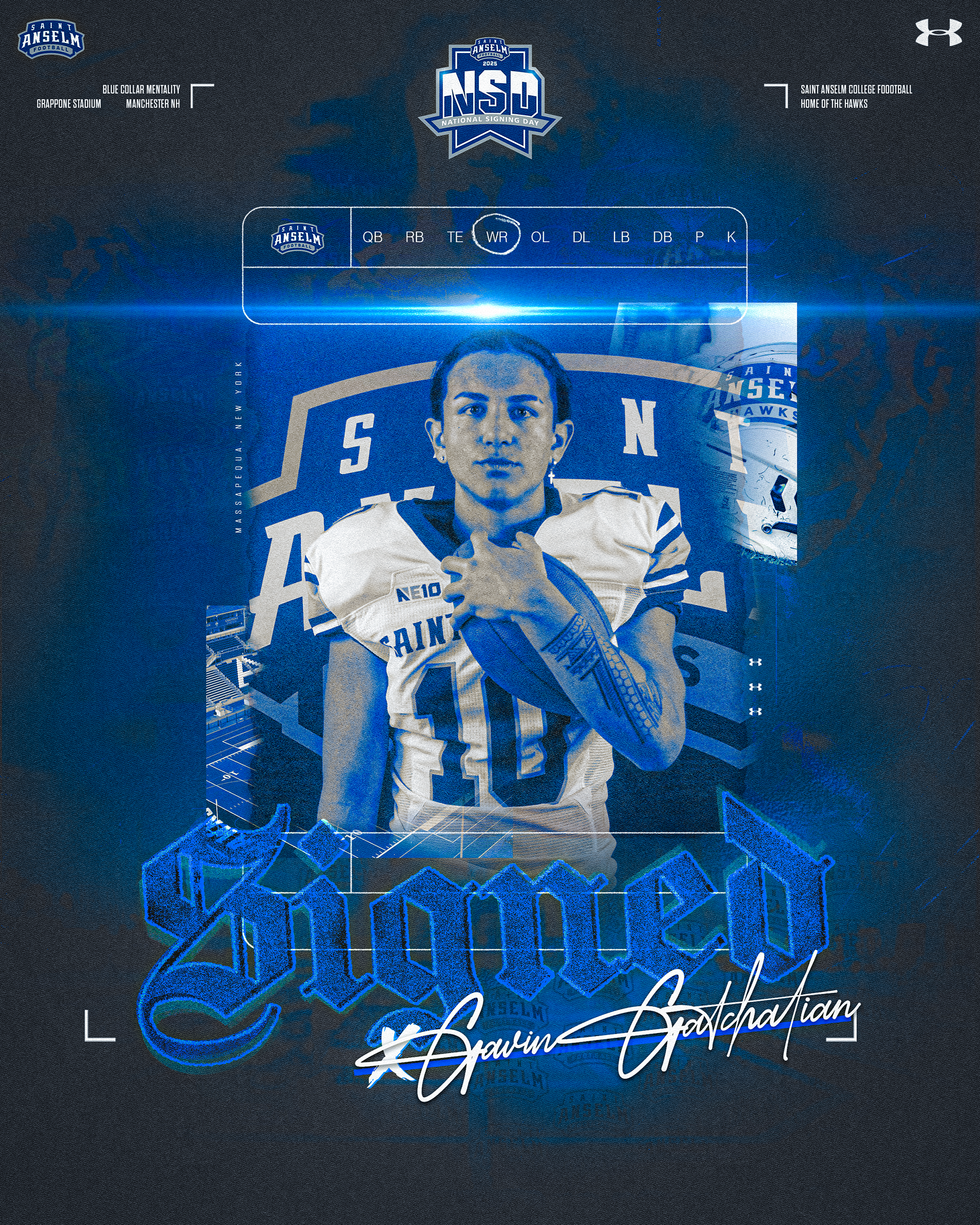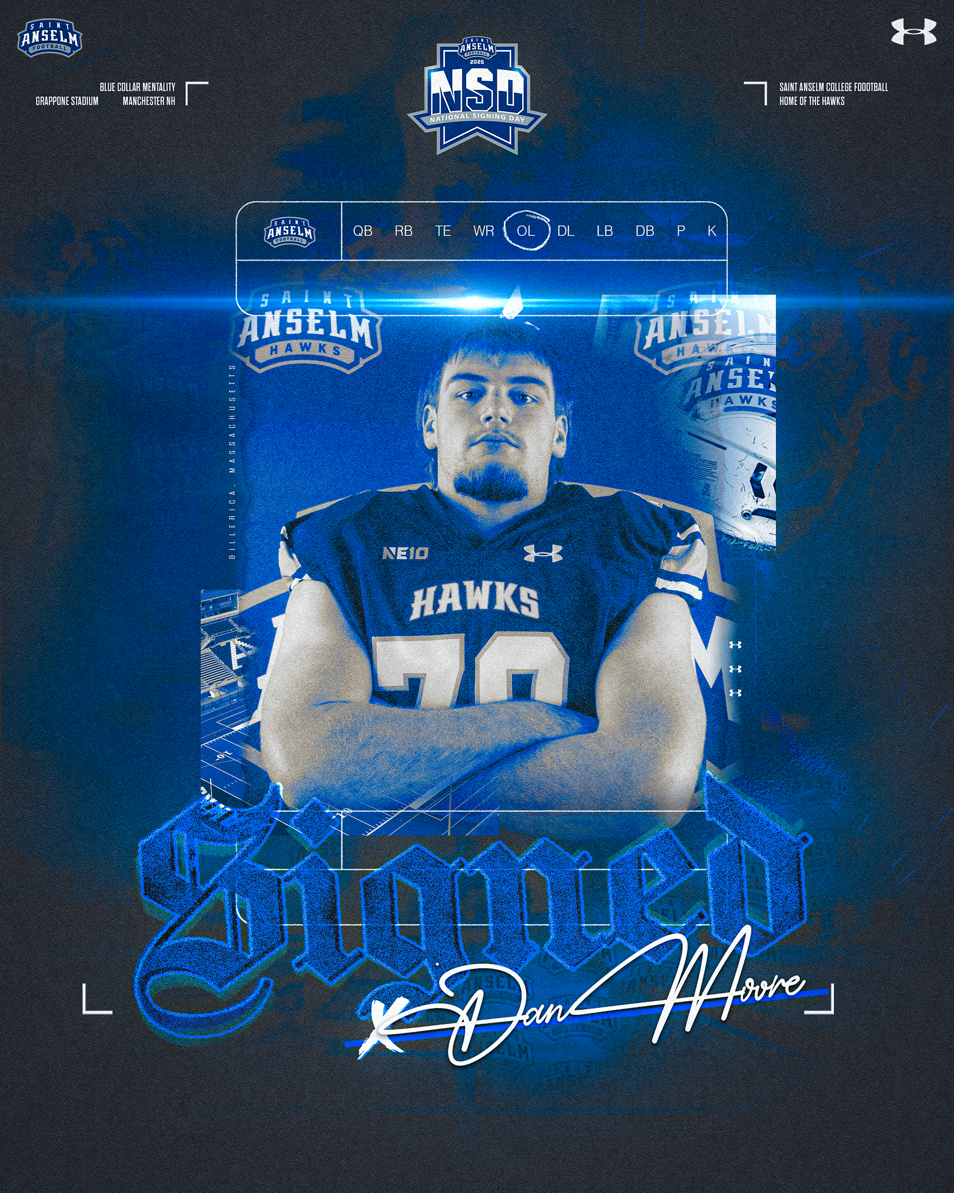 In February of 2025, I got the privilege of creating a visual identity for the Saint Anselm College Football National Signing Day class of 2025. The Hawks brought in over 40 freshman and transfer recruits to their 2025 signing class. Each recruit was given a personalized graphic that was posted to the team's Instagram & X account. Here is my work: