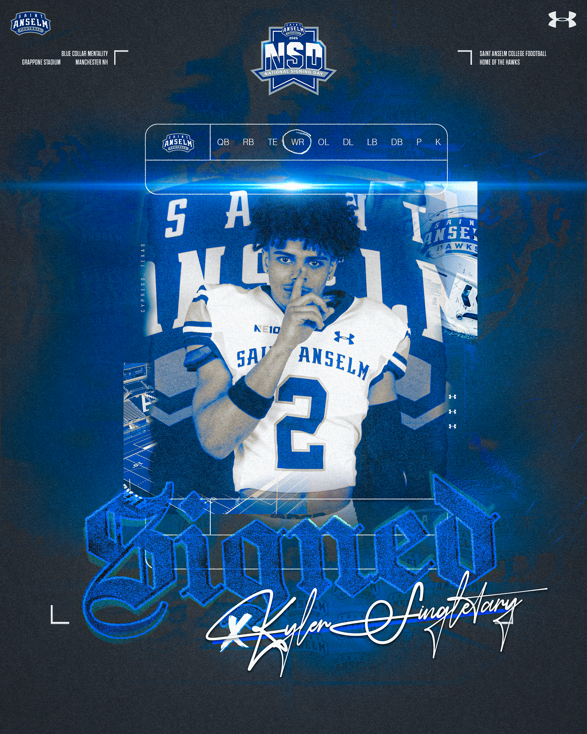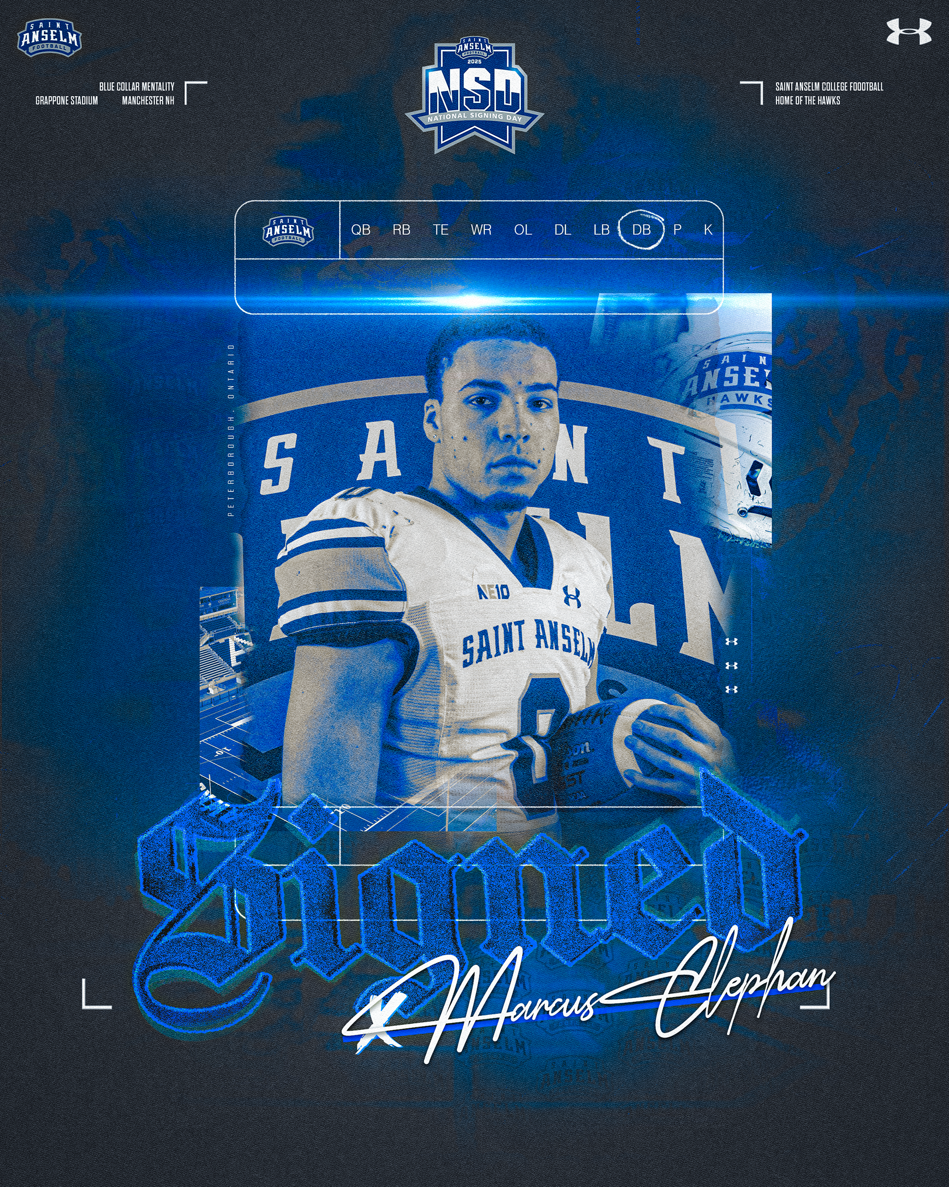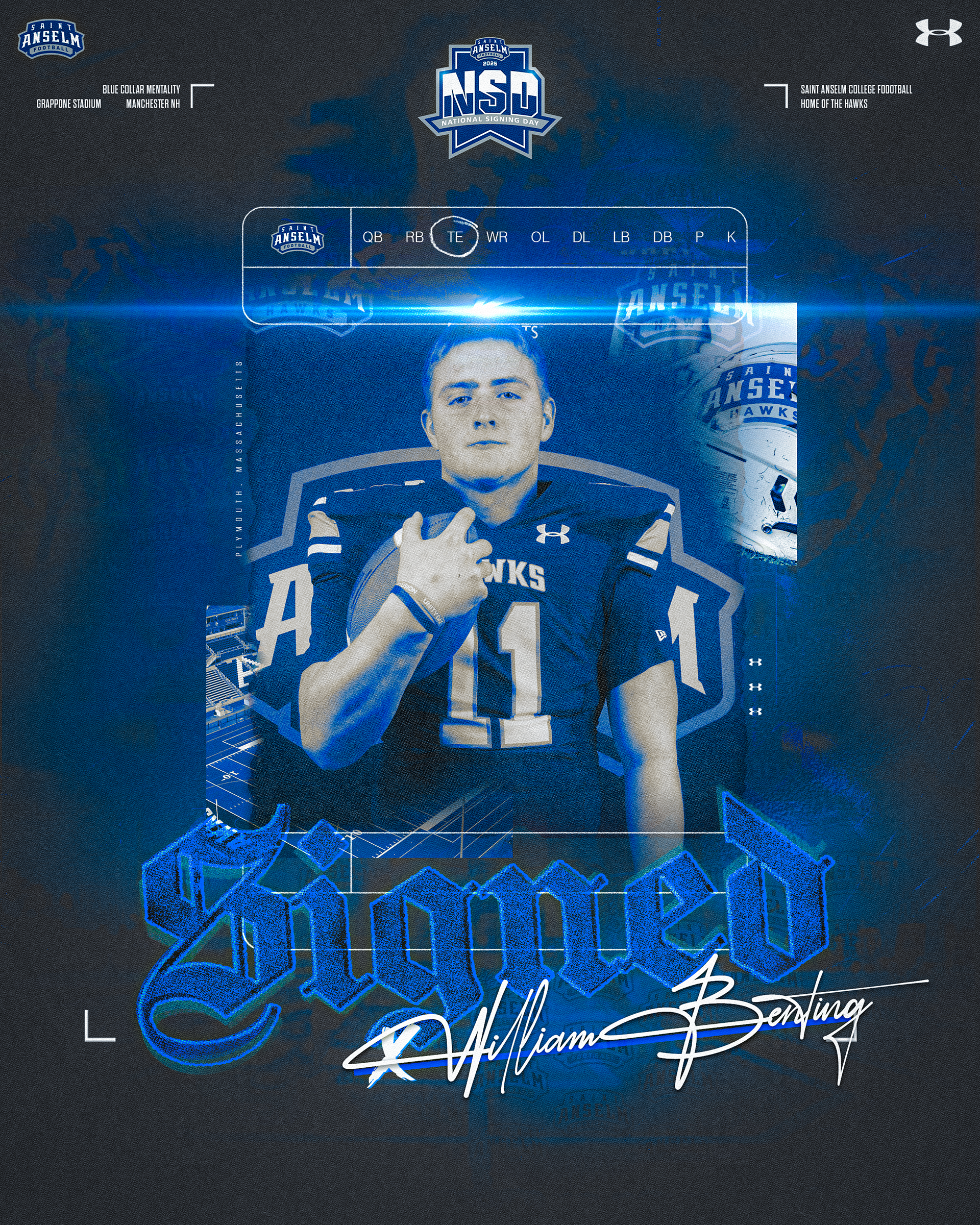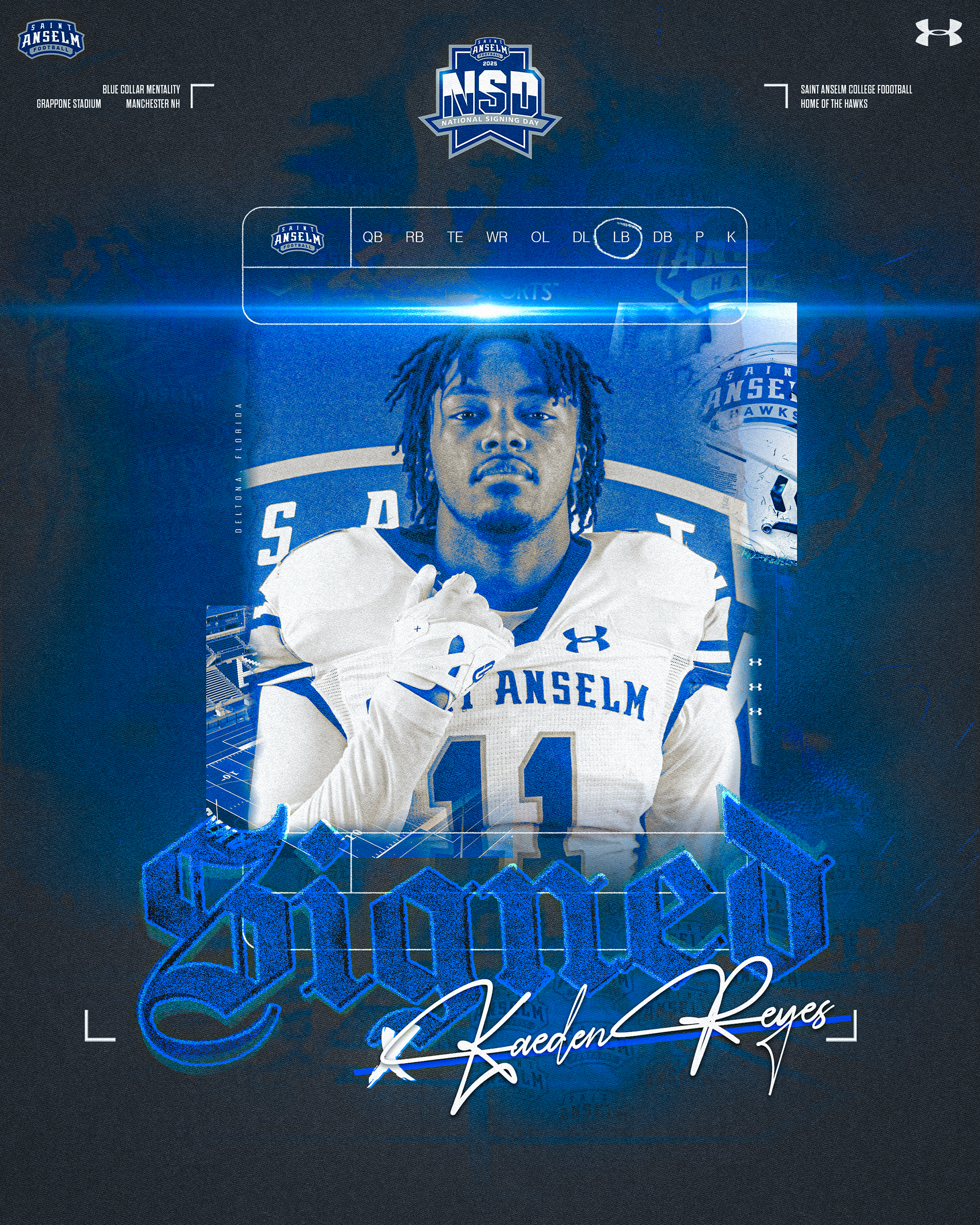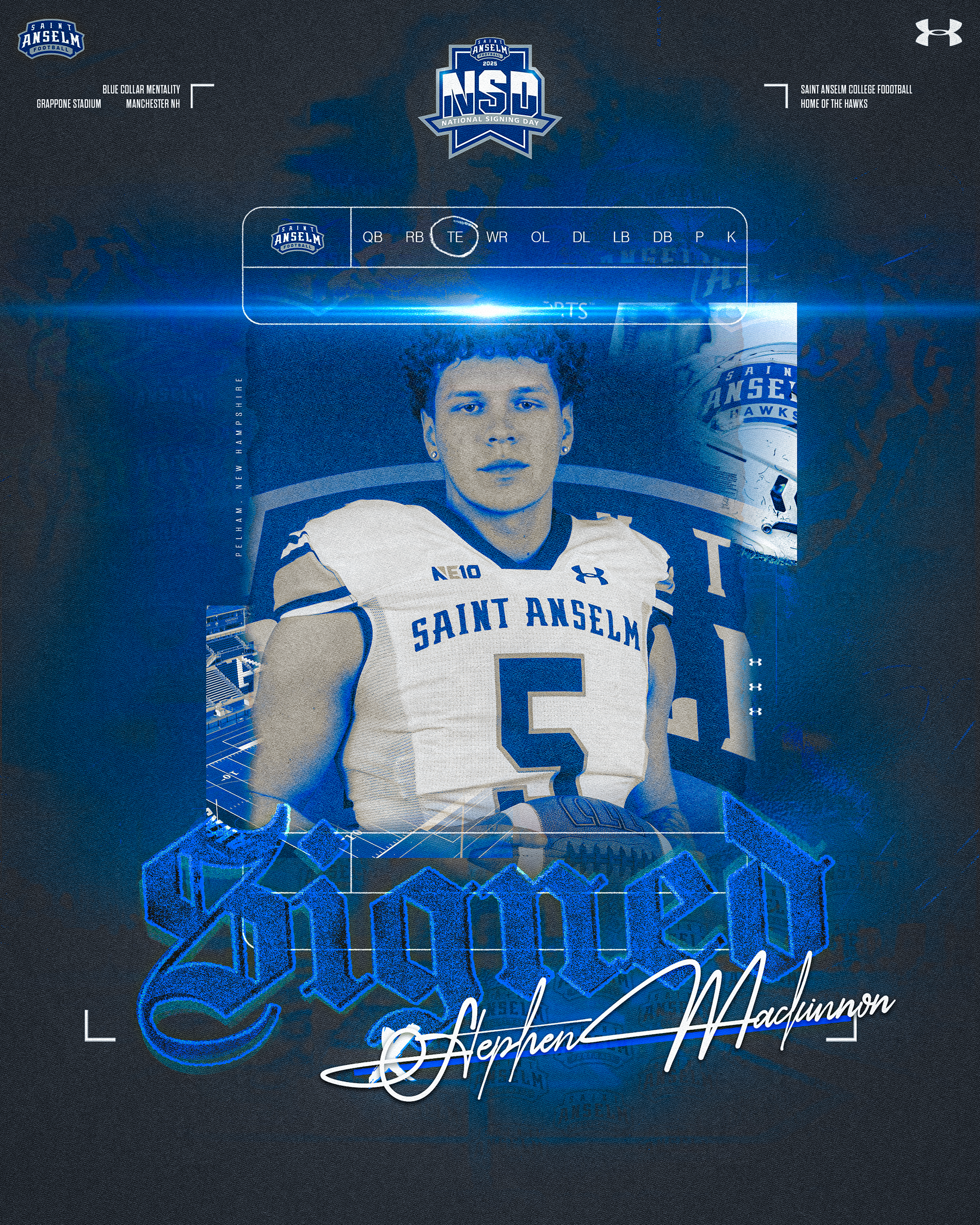In February of 2025, I got the privilege of creating a visual identity for the Saint Anselm College Football National Signing Day class of 2025. The Hawks brought in over 40 freshman and transfer recruits to their 2025 signing class. Each recruit was given a personalized graphic that was posted to the team's Instagram & X account. Here is my work: