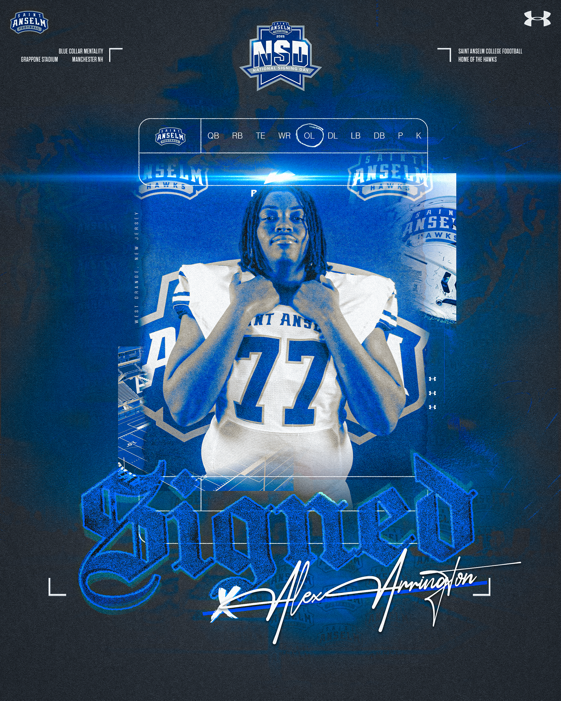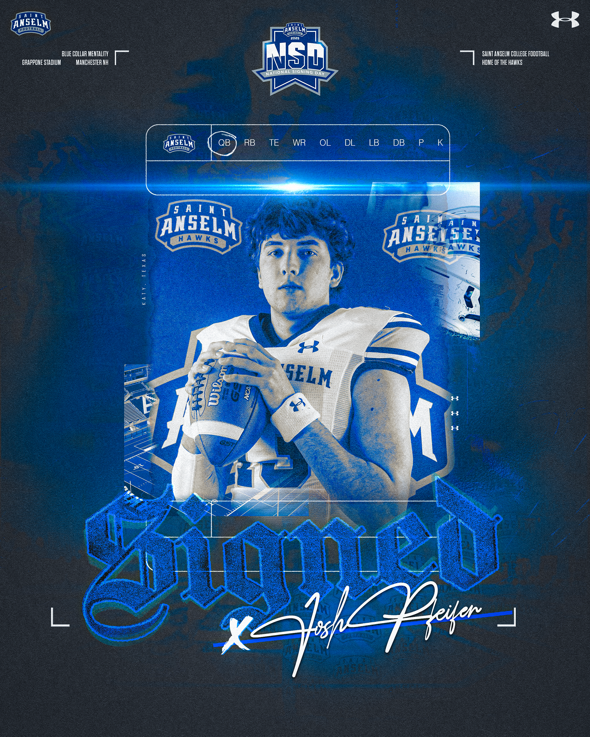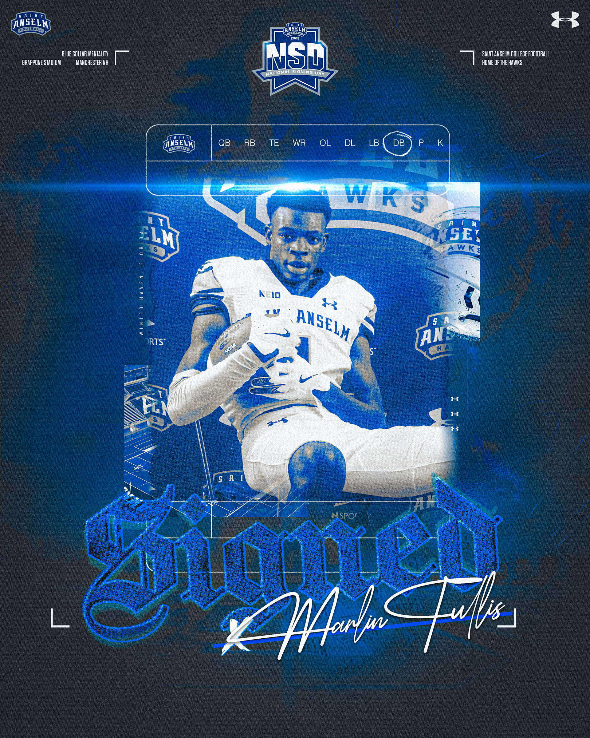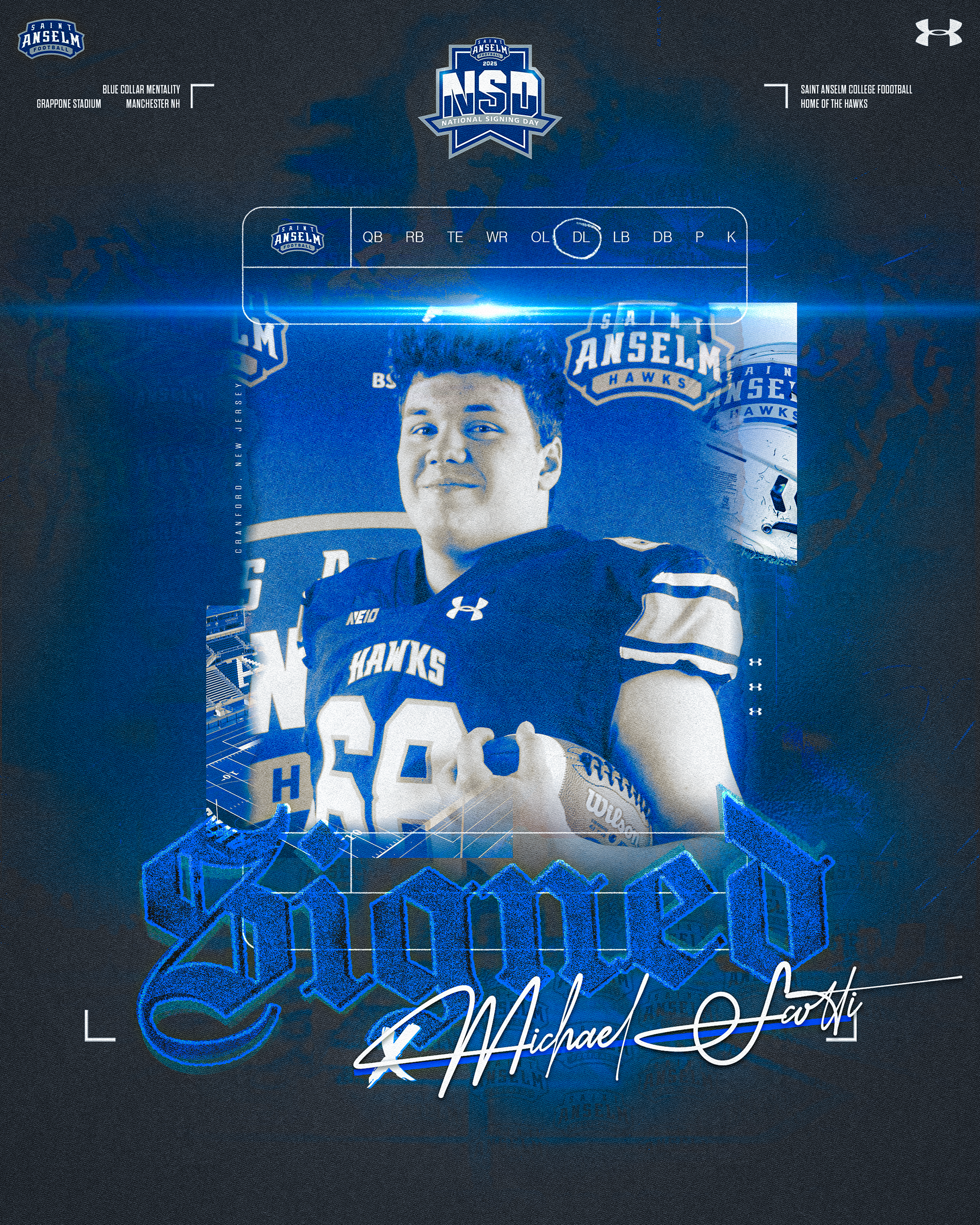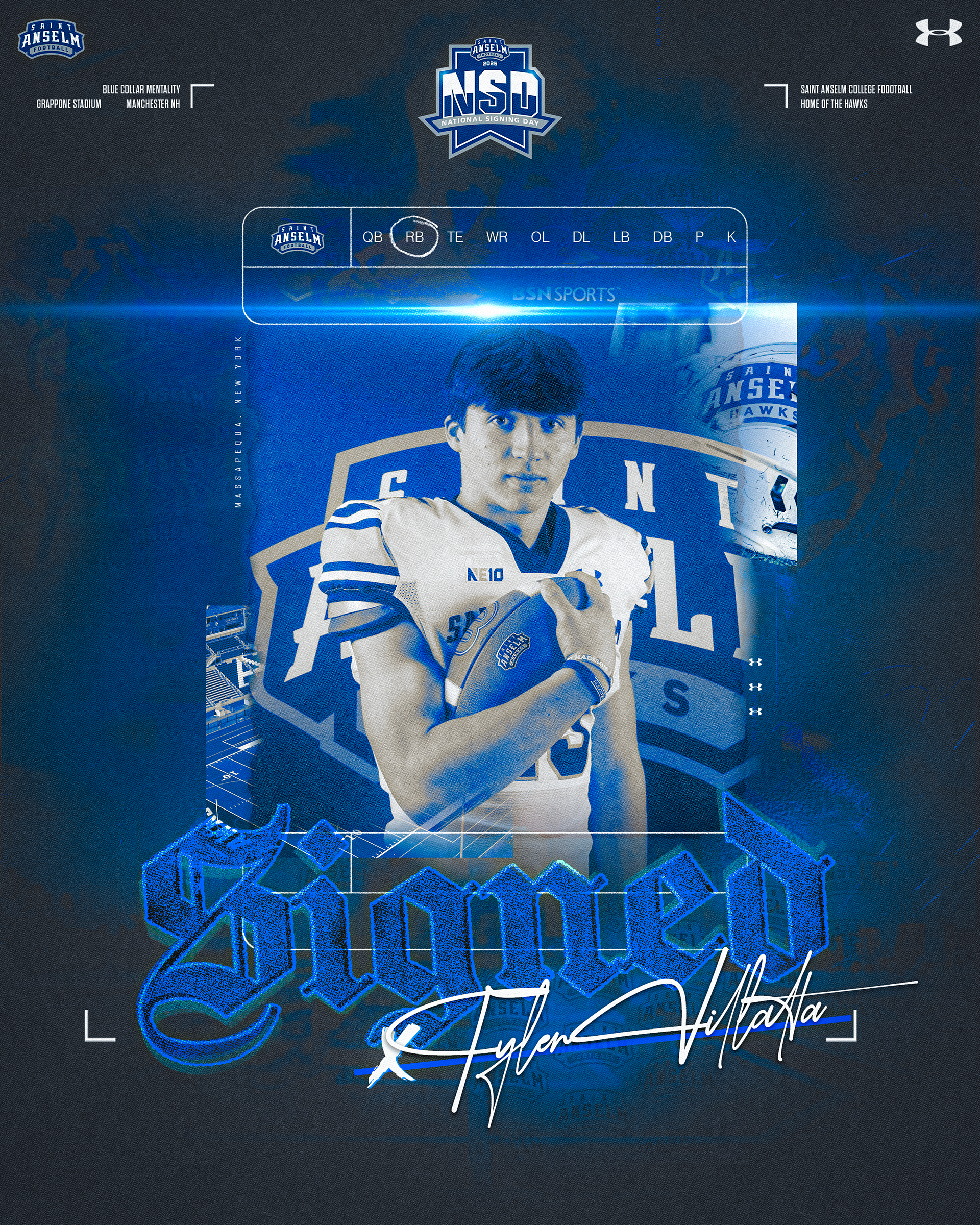 In February of 2025, I got the privilege of creating a visual identity for the Saint Anselm College Football National Signing Day class of 2025. The Hawks brought in over 40 freshman and transfer recruits to their 2025 signing class. Each recruit was given a personalized graphic that was posted to the team's Instagram & X account. Here is my work: