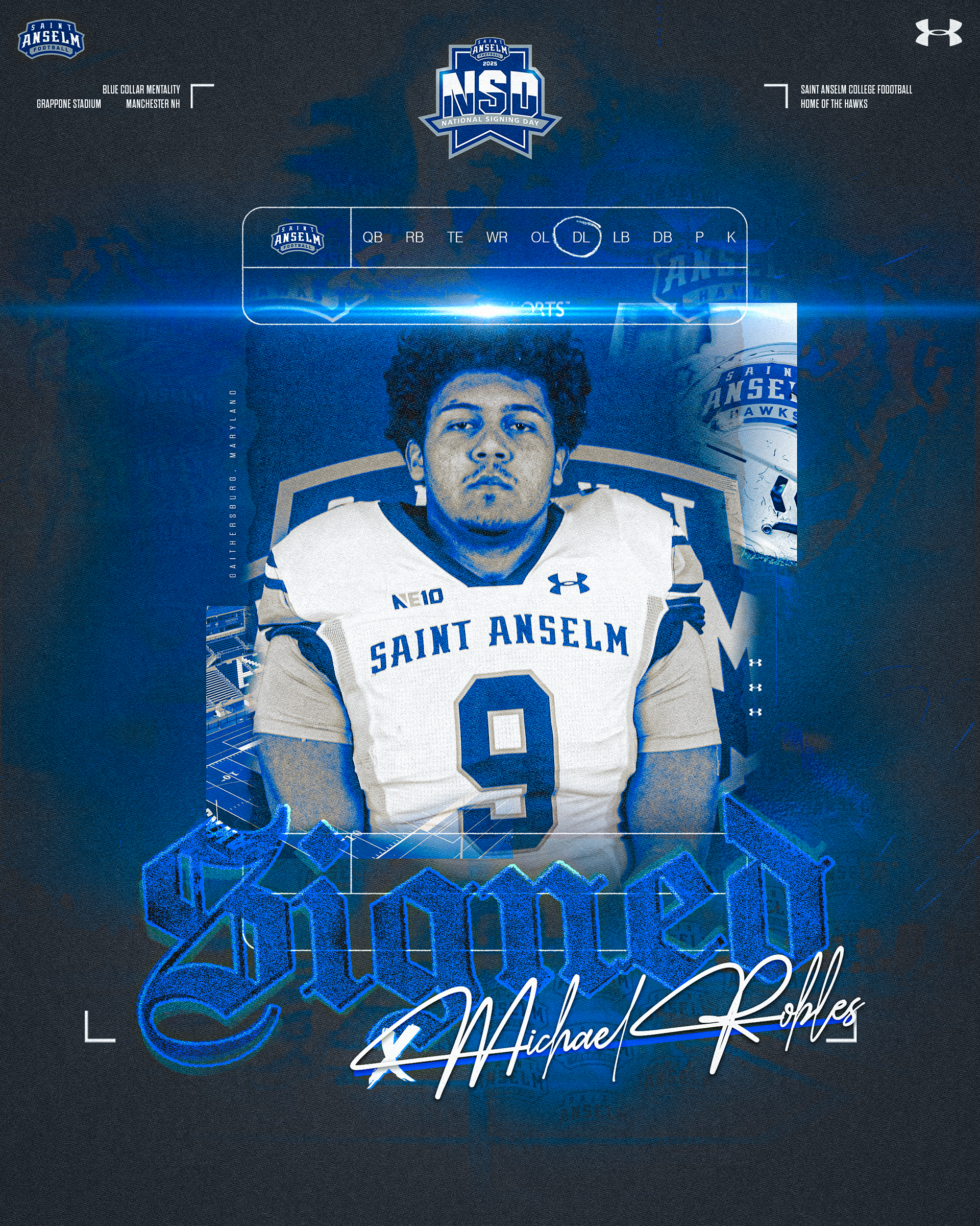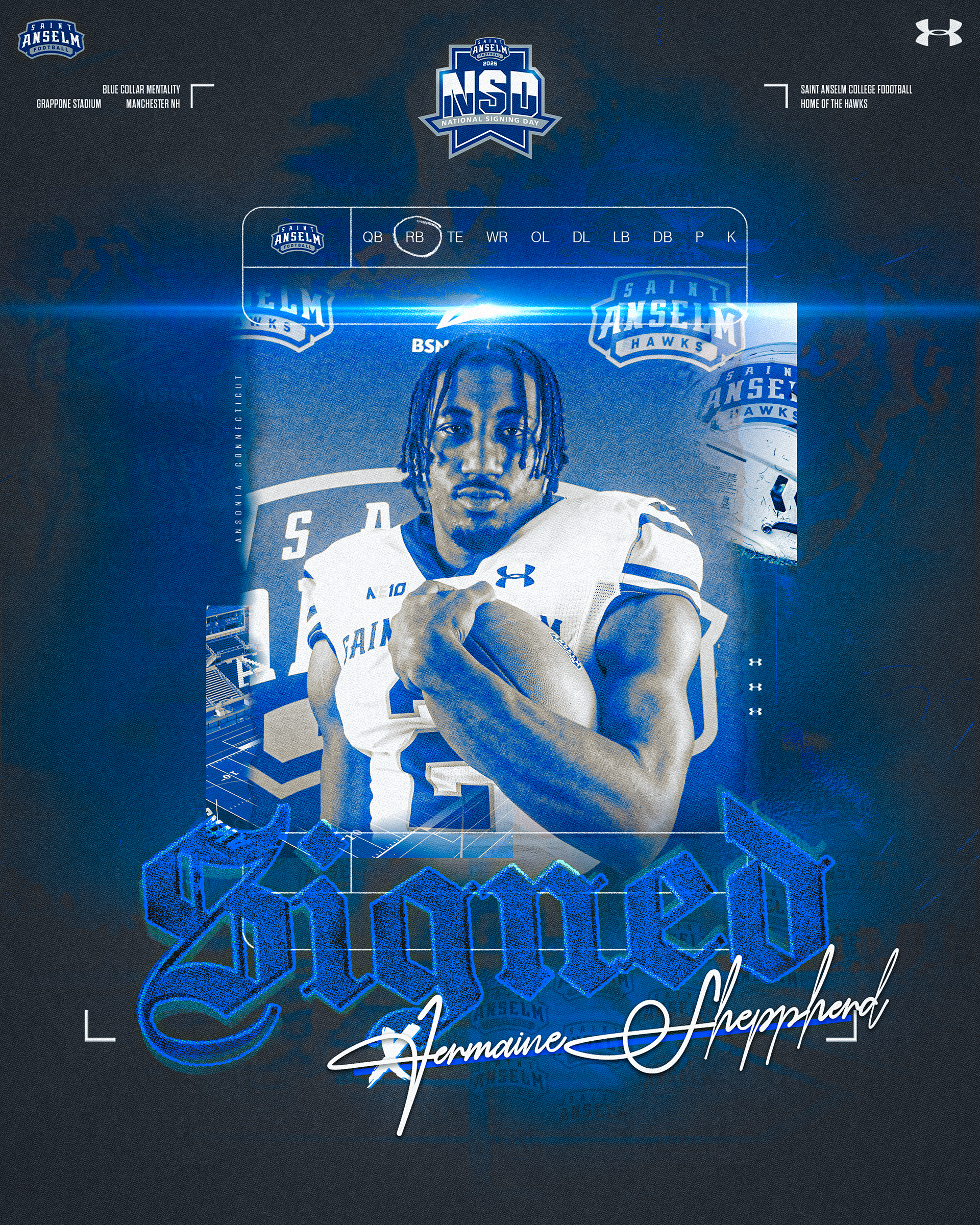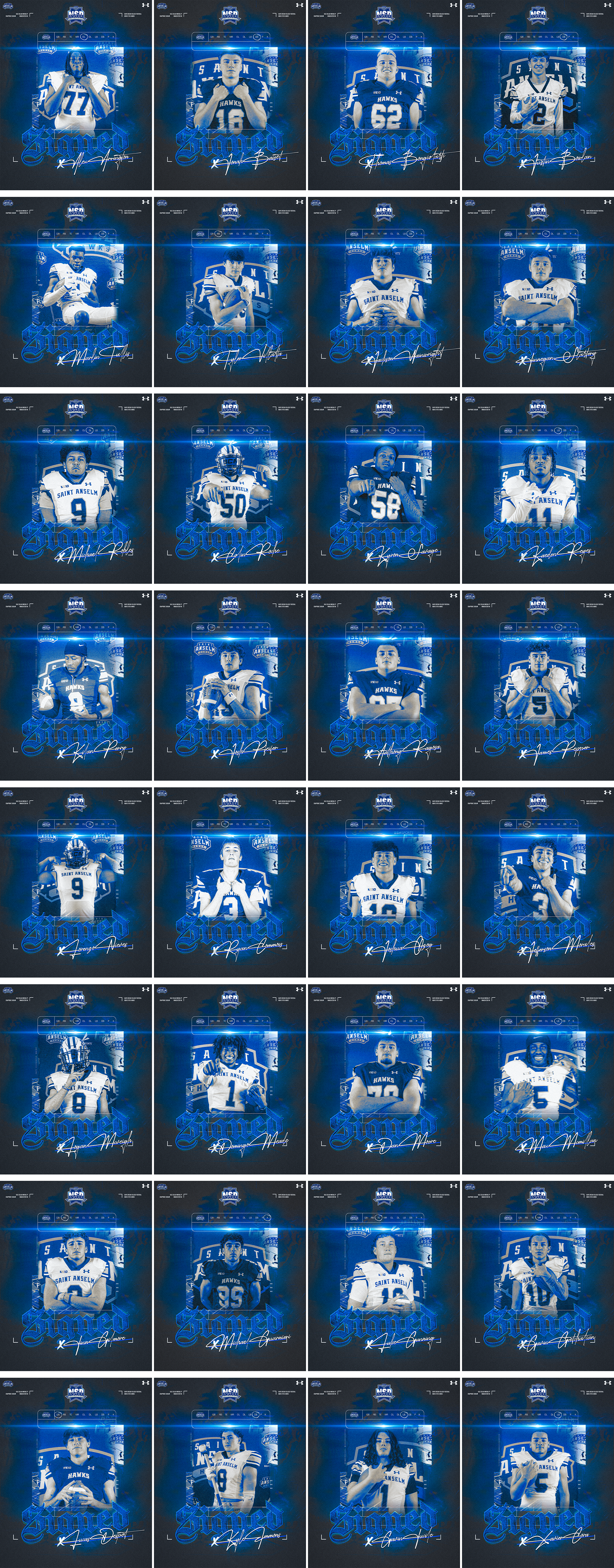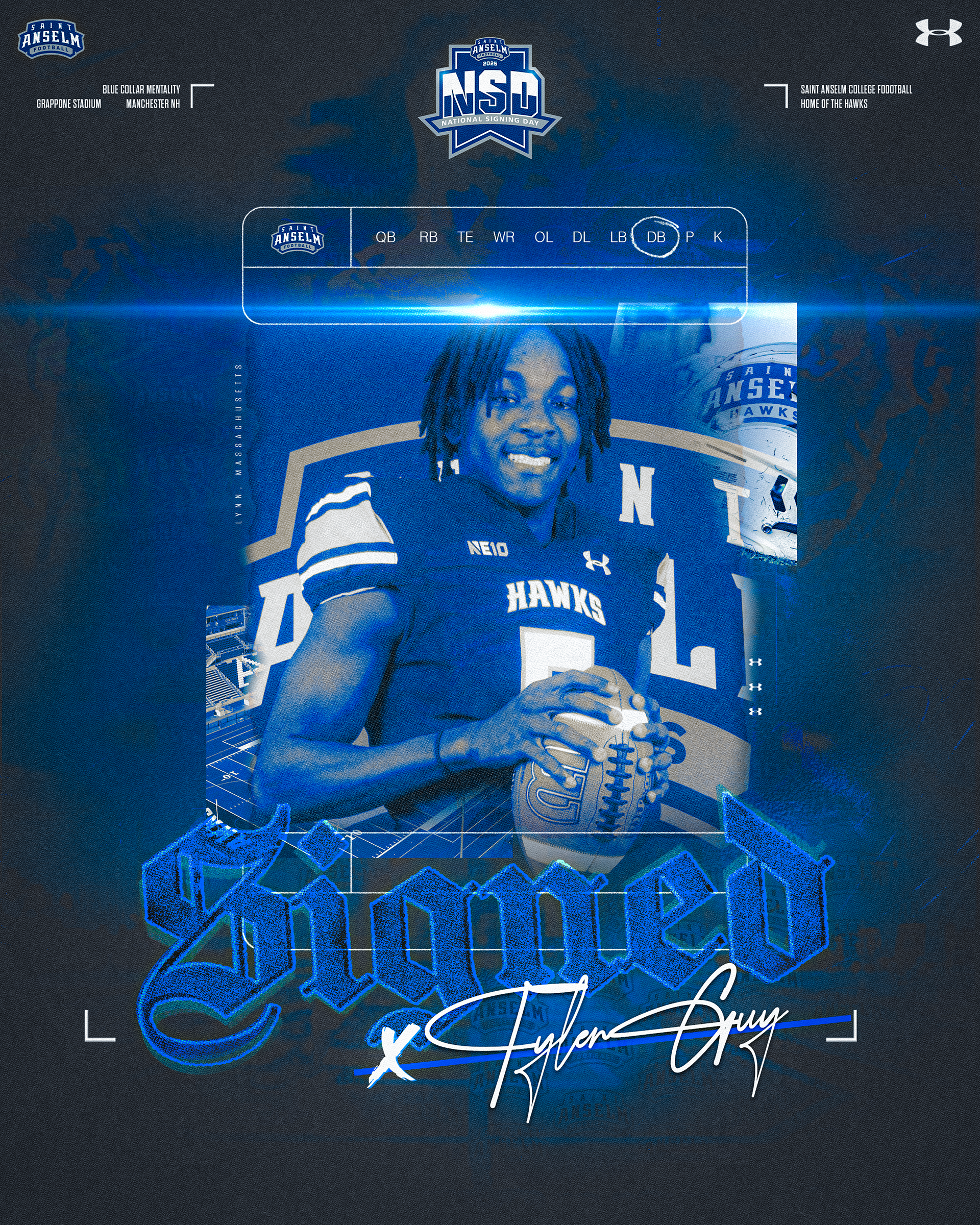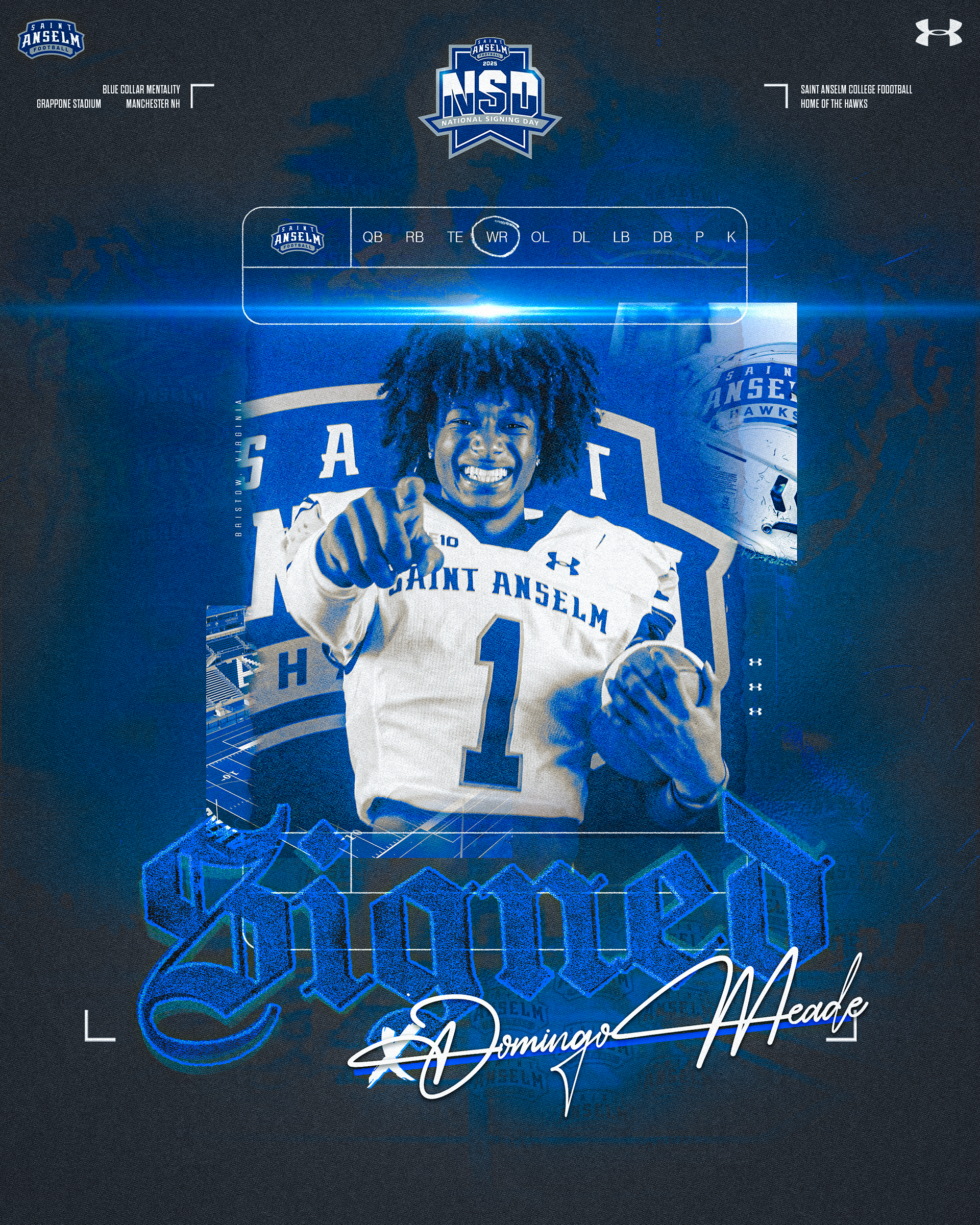 In February of 2025, I got the privilege of creating a visual identity for the Saint Anselm College Football National Signing Day class of 2025. The Hawks brought in over 40 freshman and transfer recruits to their 2025 signing class. Each recruit was given a personalized graphic that was posted to the team's Instagram & X account. Here is my work: